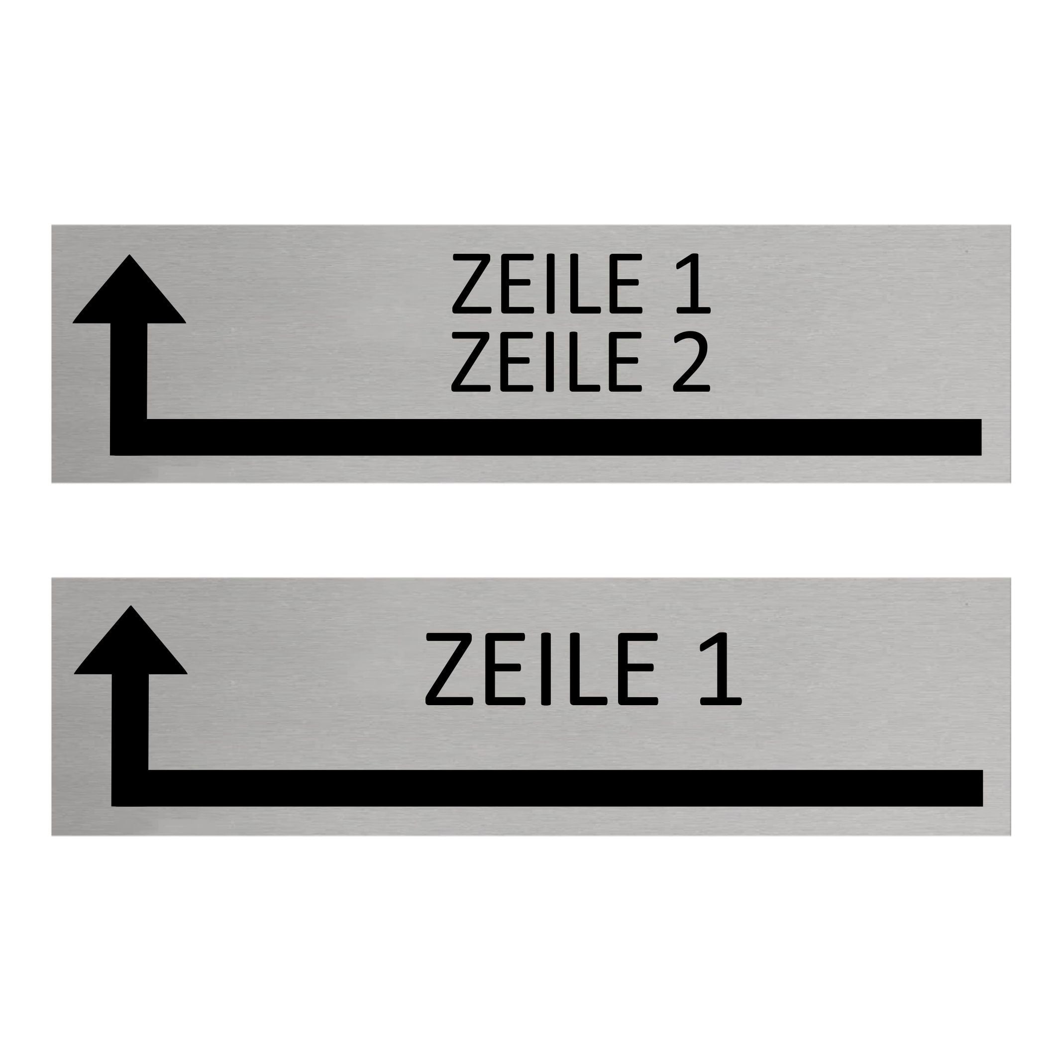 Der Wunschtext kann in bis zu zwei Zeilen mit jeweils maximal 15 Zeichen im jeweiligem Textfeld angegeben werden. Die eingegebene Schreibweise wird buchstabengetreu übernommen, inklusive Groß- und Kleinschreibung sowie Sonderzeichen. Der nach links zeigende Winkelpfeil ergänzt den Text perfekt für eine klare Richtungsanzeige.