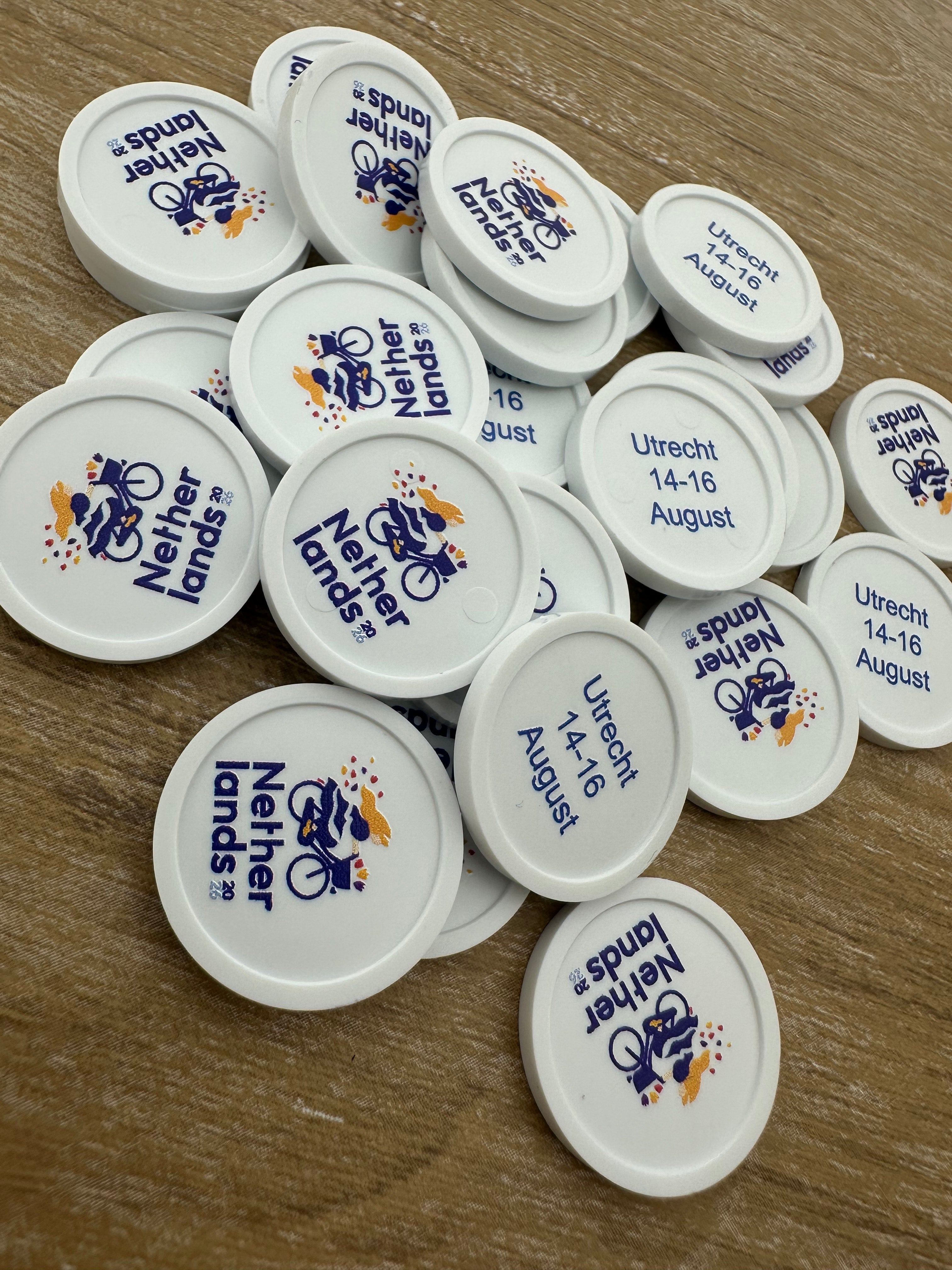Gestalten Sie Ihre eignen Einkaufswagenchips im 1€-Format, auch geeignet für andere mechanische Systeme. Ideal für den täglichen Einkauf und als Werbegeschenk. Die Einkaufswagenchips sind in einer Packung mit 100 Stück erhältlich und lassen sich mit Ihrem Logo, Text oder Motiv personalisieren.