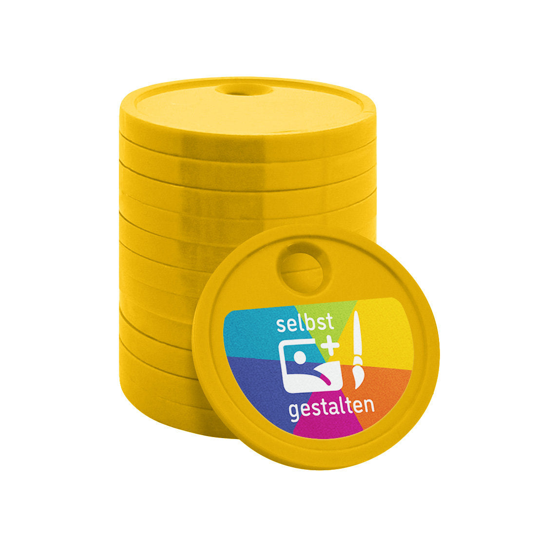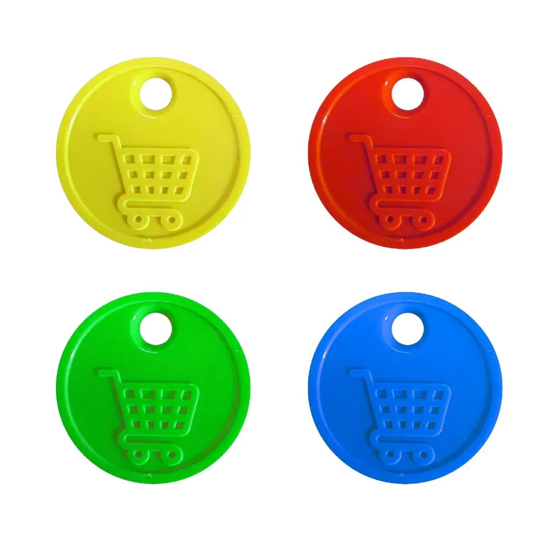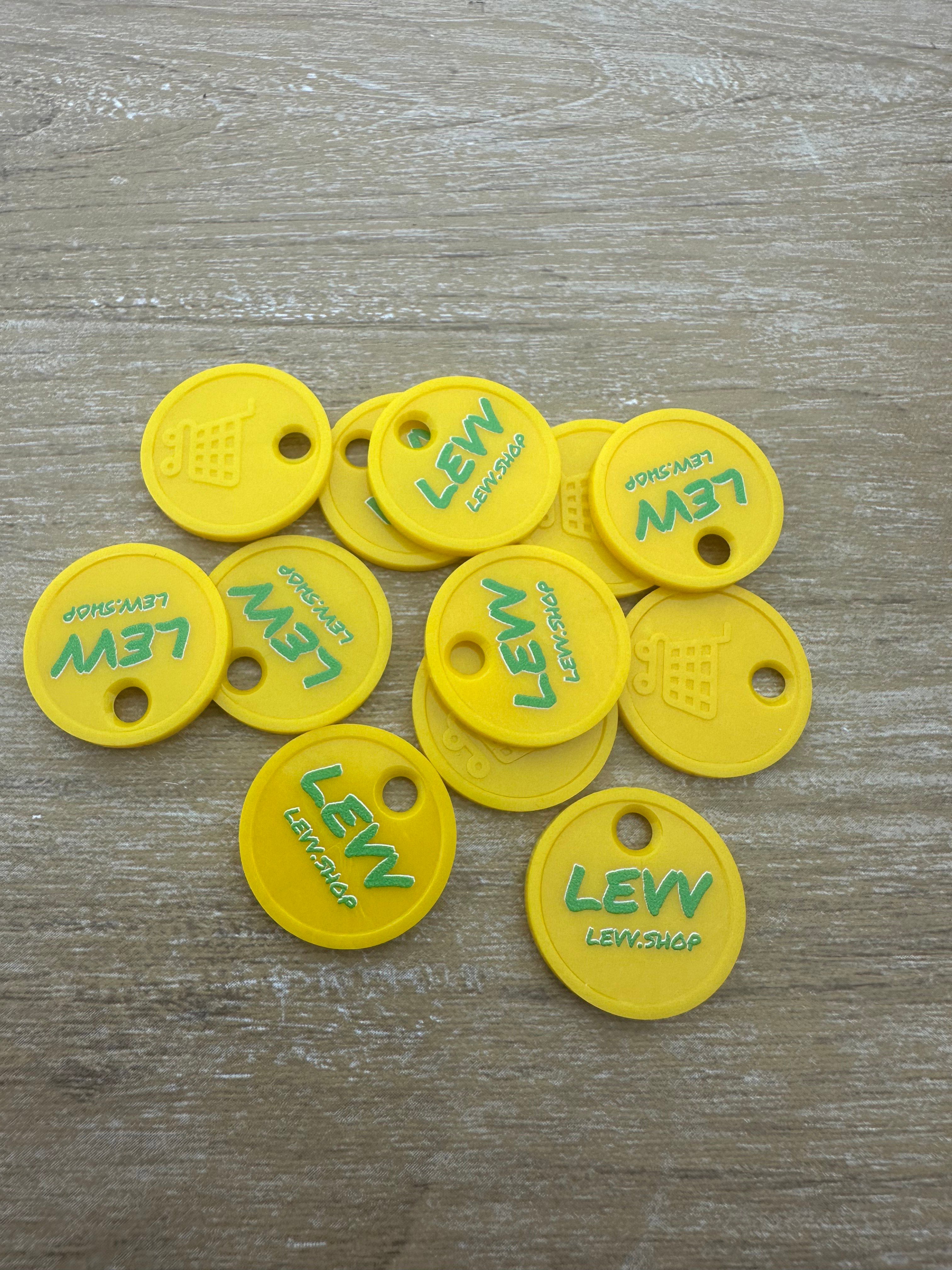 Farbige Einkaufswagenchips aus robustem Kunststoff im 50-Cent-Format (24 mm) mit erhöhtem Rand und ca. 2,2 mm Dicke. Vorderseite mit Standard-Einkaufswagen-Relief, Rückseite individuell bedruckbar in Vollfarbe. Ideal für Einkaufswagen, Trolleys, Schließfächer und mehr. Pro 100 Stück.