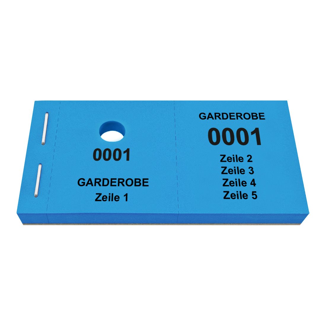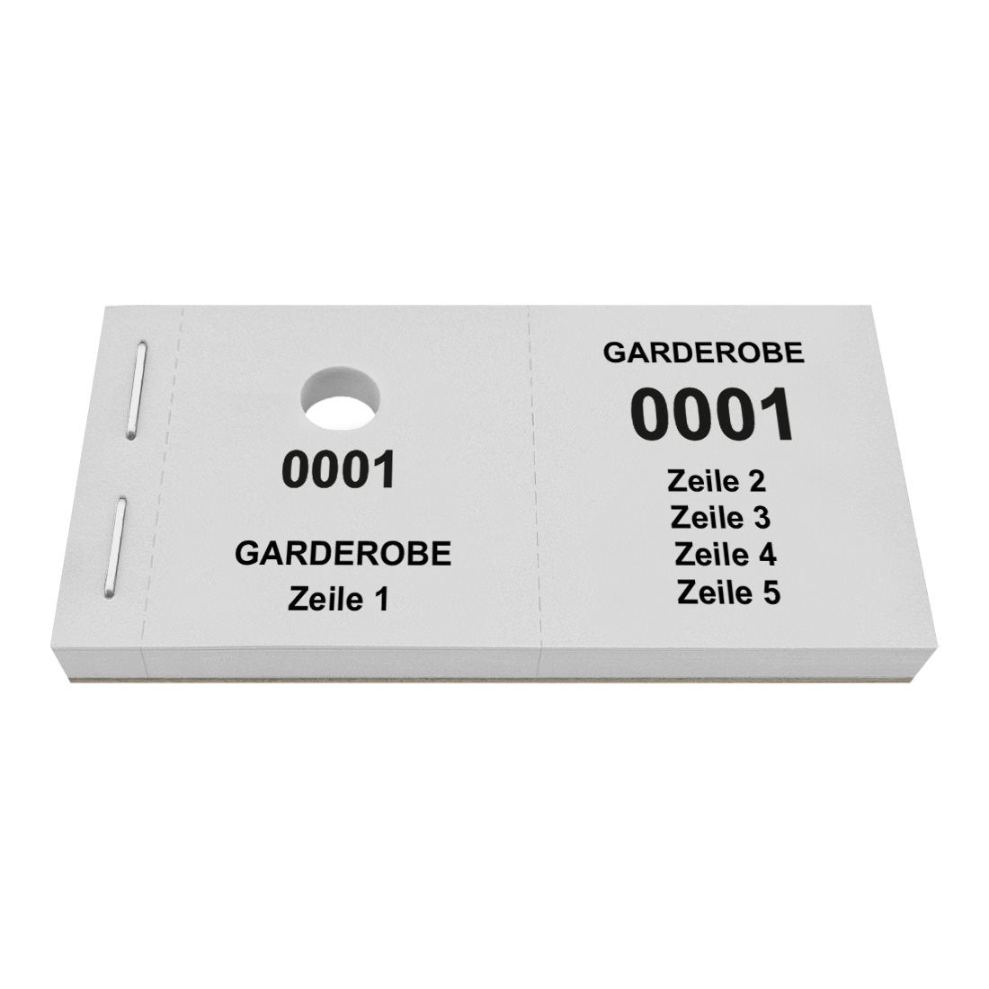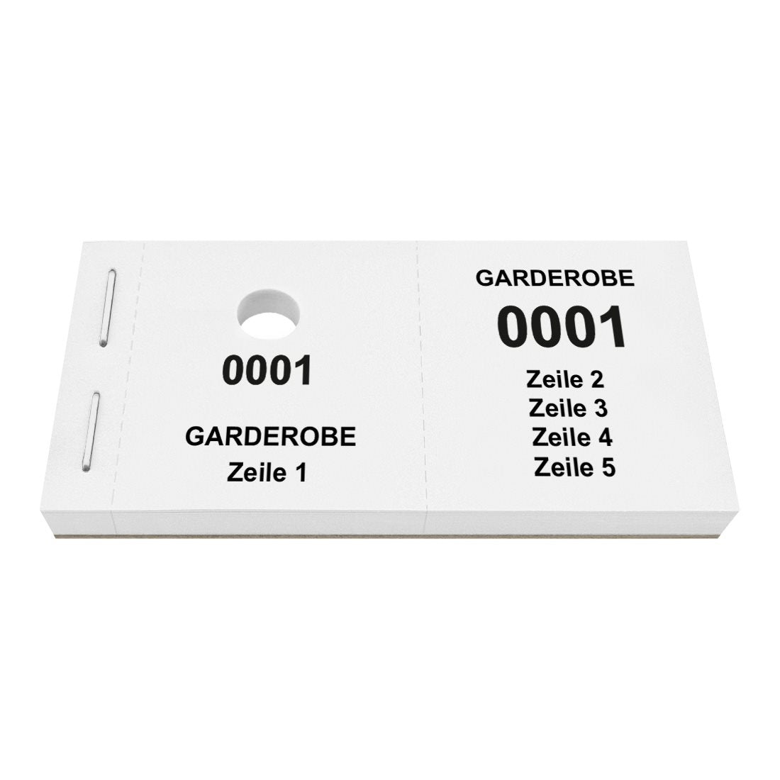 Die Garderobenmarken sind in praktischen Blöcken gebündelt, die eine Größe von 105 x 55,8 mm aufweisen. Sowohl der linke als auch der rechte Bon messen 47,5 x 55,8 mm. Die Marken bestehen aus hochwertigem 120 g/m² Papier und sind mit einem Lochstanzung für Kleiderbügel versehen. Dank Perforation, lassen sich die Bons leicht herausreißen und trennen. Dies gewährleistet eine schnelle und effiziente Ausgabe, selbst während Stoßzeiten. Die Garderobenmarken lassen sich individuell mit Text personalisieren und sind ideal für Theater, Konzerthallen, Clubs oder Hotels. Es stehen bis zu 5 Zeilen Text mit jeweils maximal 15 Zeichen pro Zeile (einschließlich Leerzeichen) zur Verfügung.