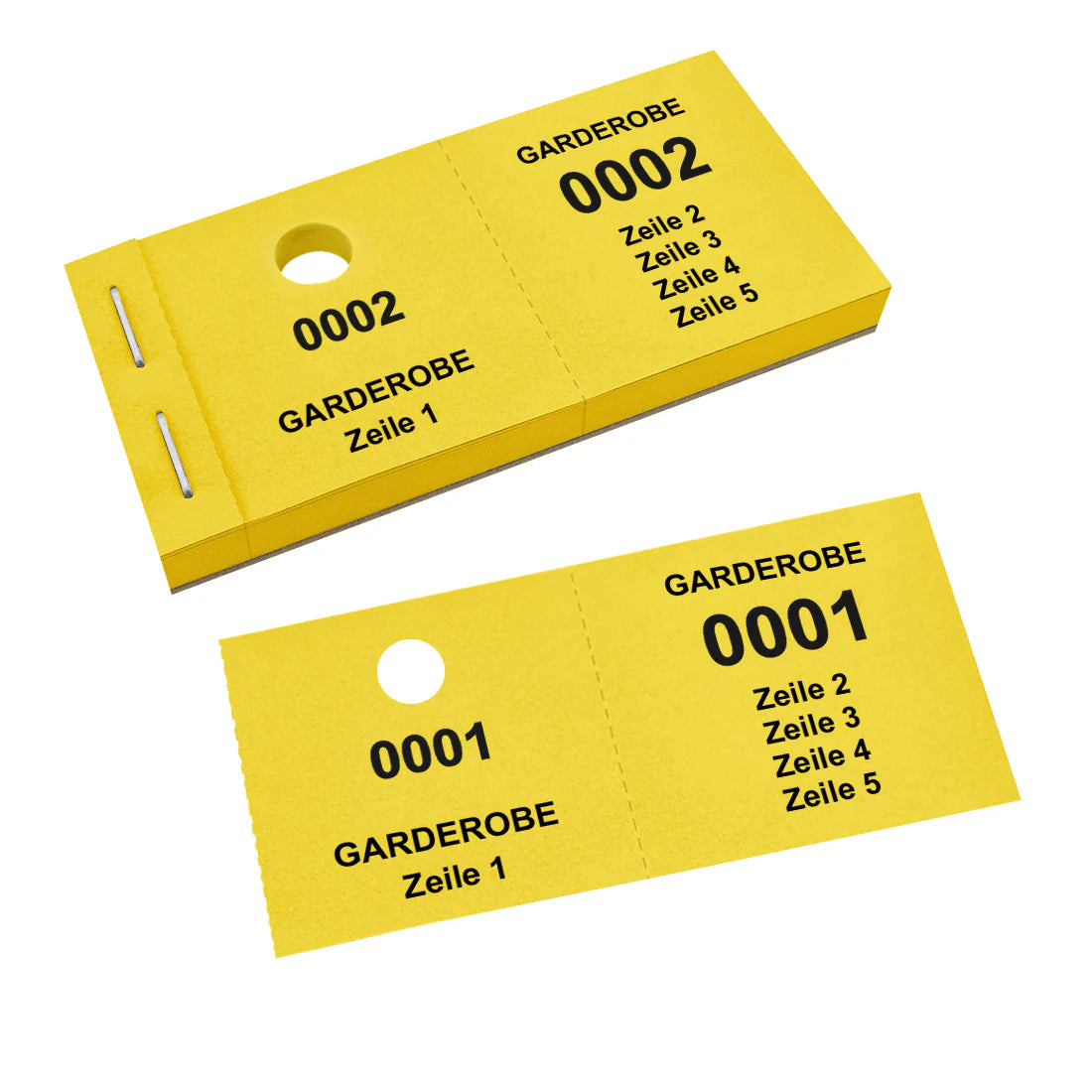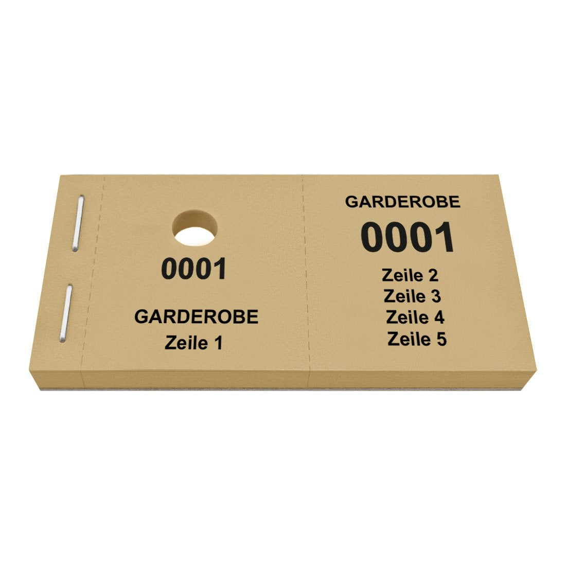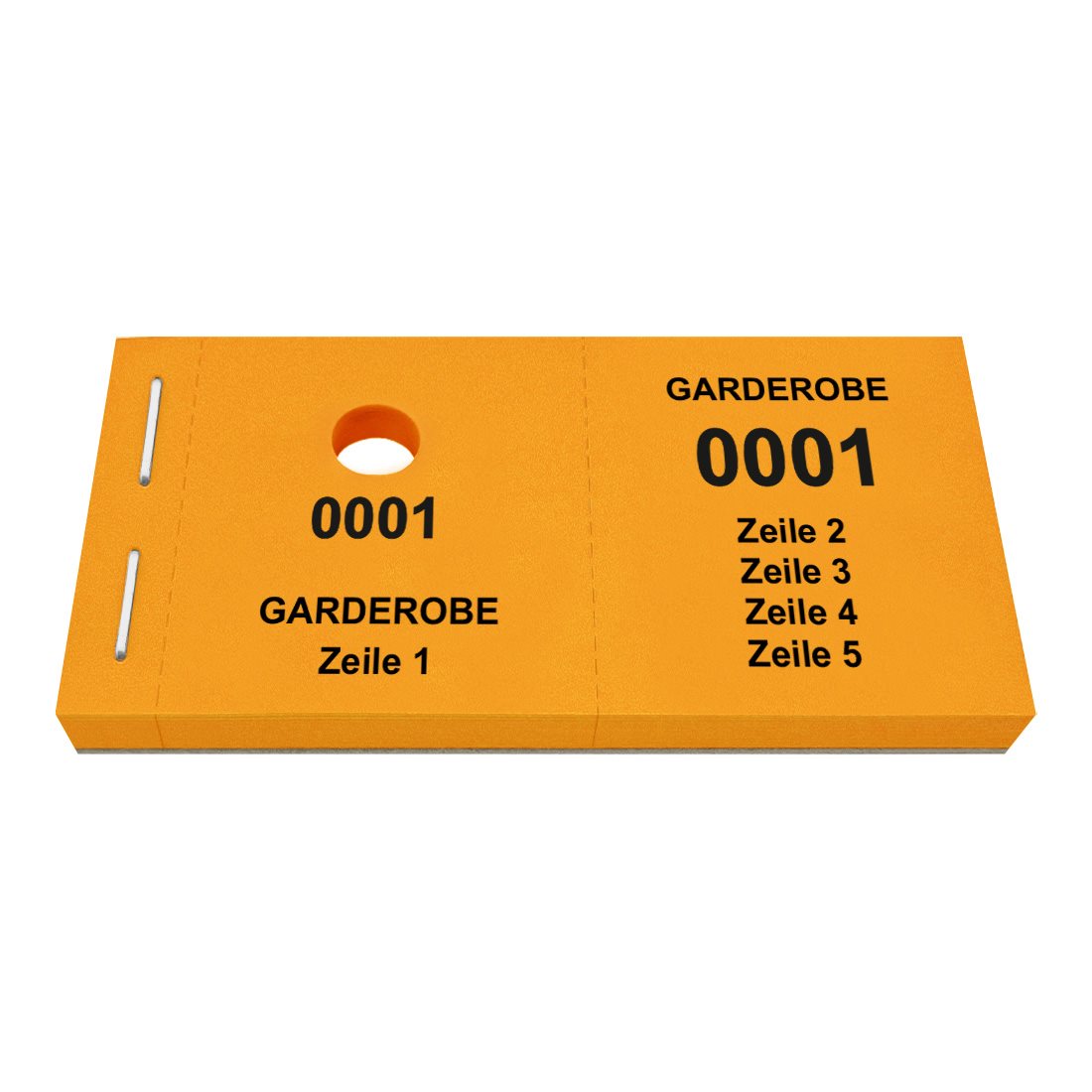 Die Garderobenmarken sind in praktischen Blöcken gebündelt, die eine Größe von 105 x 55,8 mm aufweisen. Sowohl der linke als auch der rechte Bon messen 47,5 x 55,8 mm. Die Marken bestehen aus hochwertigem 120 g/m² Papier und sind mit einem Lochstanzung für Kleiderbügel versehen. Dank Perforation, lassen sich die Bons leicht herausreißen und trennen. Dies gewährleistet eine schnelle und effiziente Ausgabe, selbst während Stoßzeiten. Die Garderobenmarken lassen sich individuell mit Text personalisieren und sind ideal für Theater, Konzerthallen, Clubs oder Hotels. Es stehen bis zu 5 Zeilen Text mit jeweils maximal 15 Zeichen pro Zeile (einschließlich Leerzeichen) zur Verfügung.