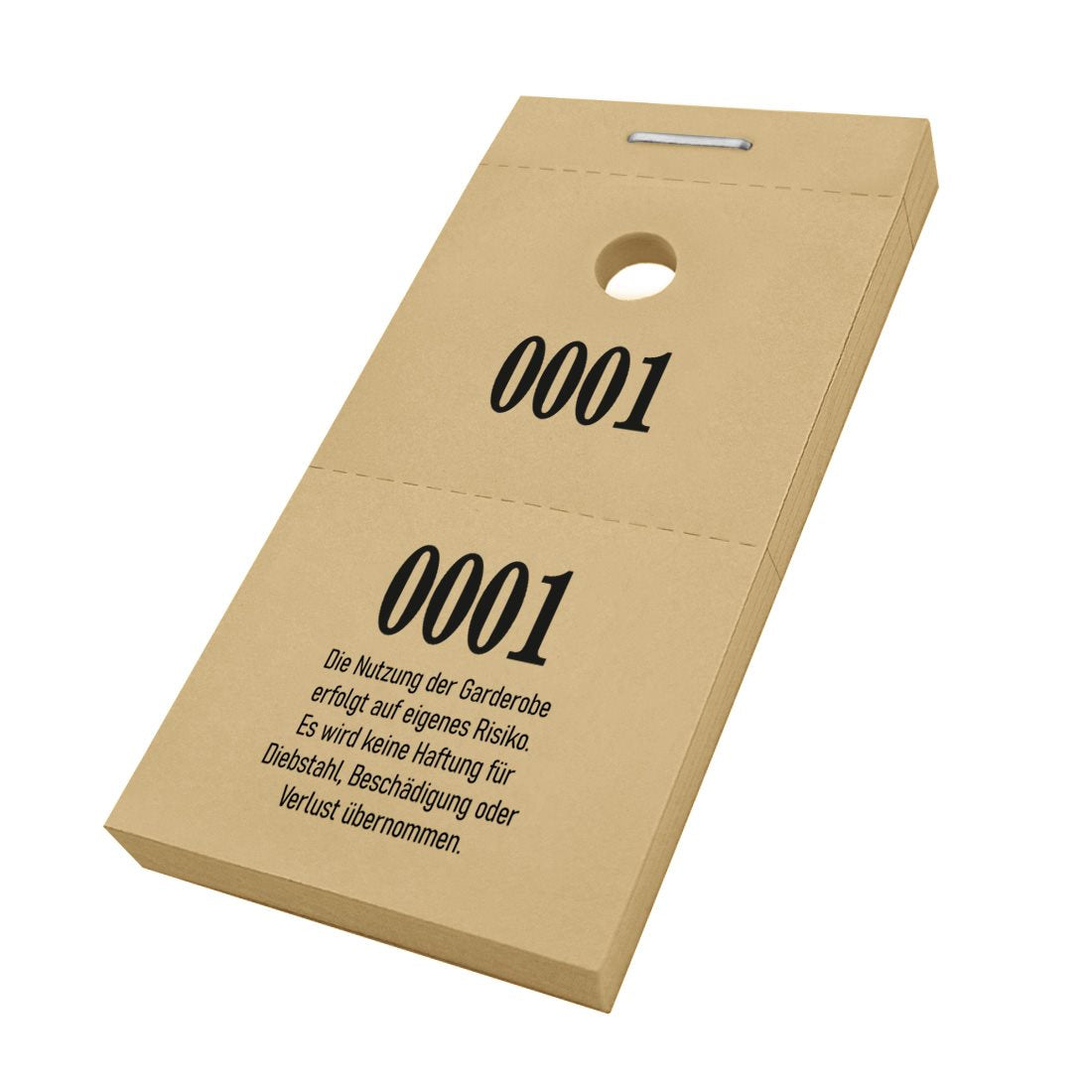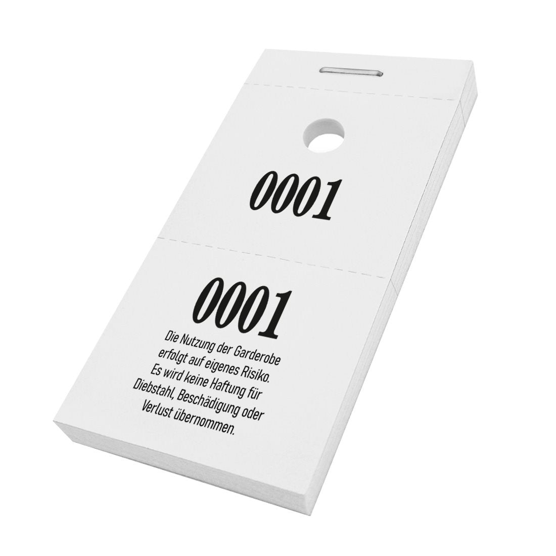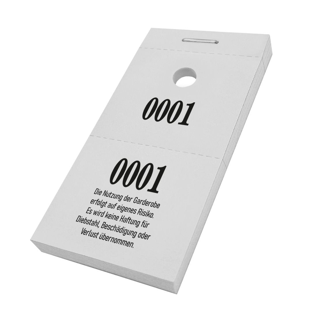 Garderobemarken mit fortlaufernder Nummerierung und Haftungsausschluss, 55,8 x 105 mm und Aufhängeloch - 20 Blöcke mit 50 Abrissen