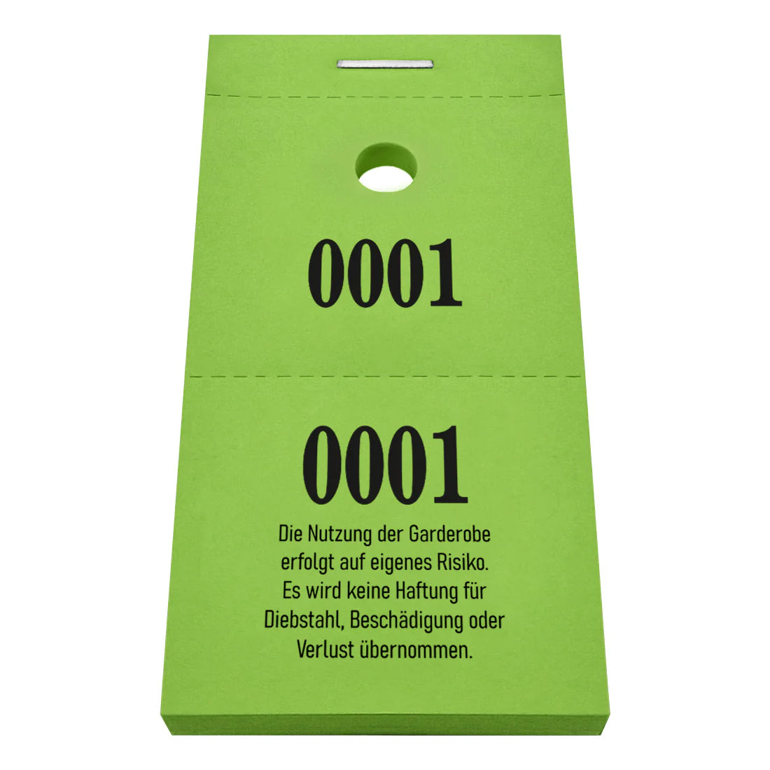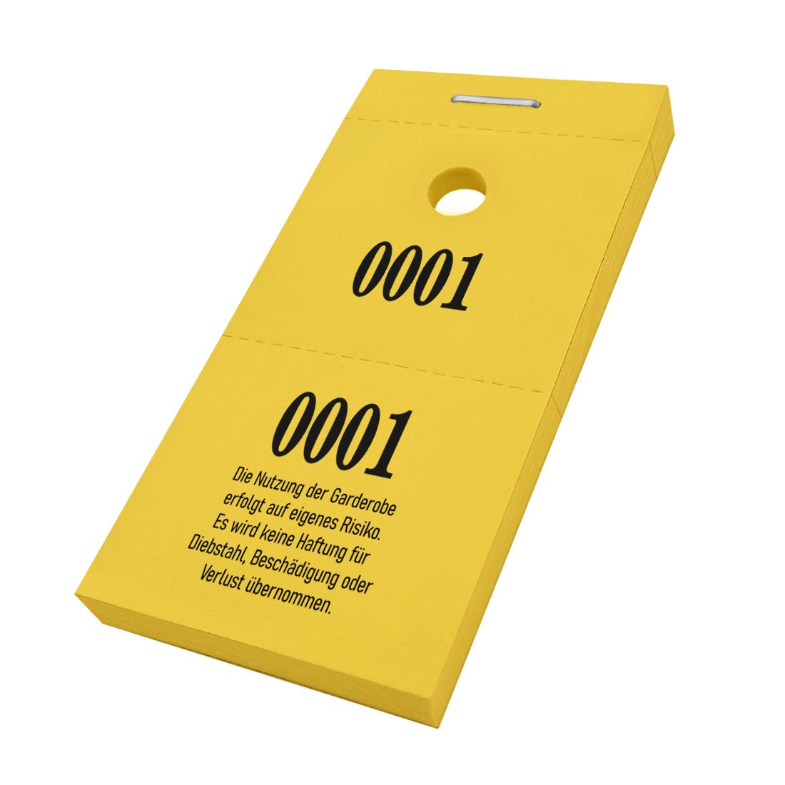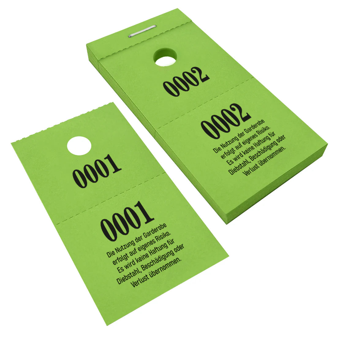 Garderobemarken mit fortlaufernder Nummerierung und Haftungsausschluss, 55,8 x 105 mm und Aufhängeloch - 20 Blöcke mit 50 Abrissen