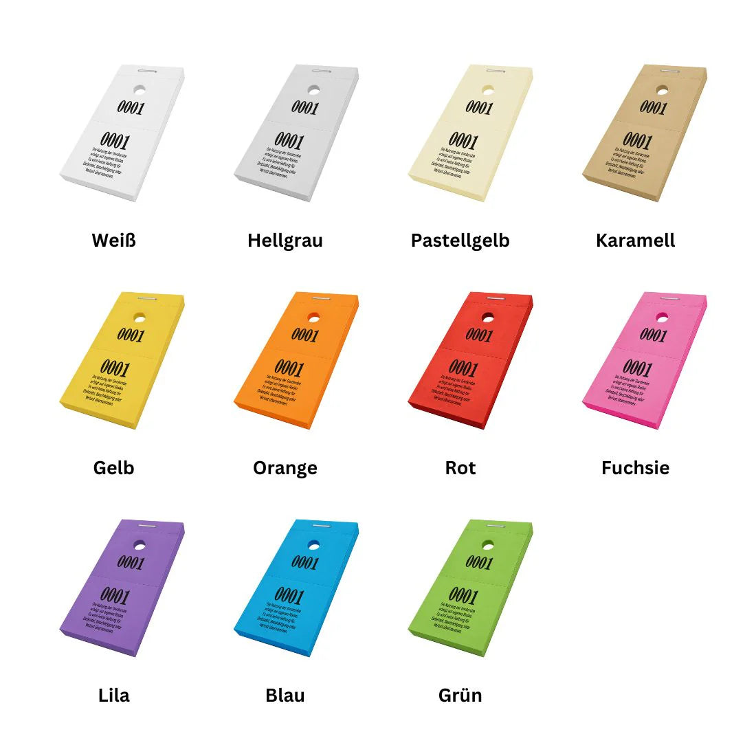Die Marken sind fortlaufend von 0001 bis 1000 nummeriert. Bei einer Bestellung von, zum Beispiel, 5 x 1000 Garderobenmarken erhalten Sie die Nummern von 0001 bis 5000. Die Nummern werden deutlich sichtbar in Schwarz gedruckt. Bei Bestellungen in mehreren Farben beginnt die Nummerierung der jeweiligen Farbe bei 0001. Falls Sie eine spezifische Nummerierung wünschen, können Sie dies im Kommentarfeld Ihrer Bestellung angeben. Bitte beachten Sie, dass bei einer individuellen Nummerierung das Rückgaberecht entfällt.