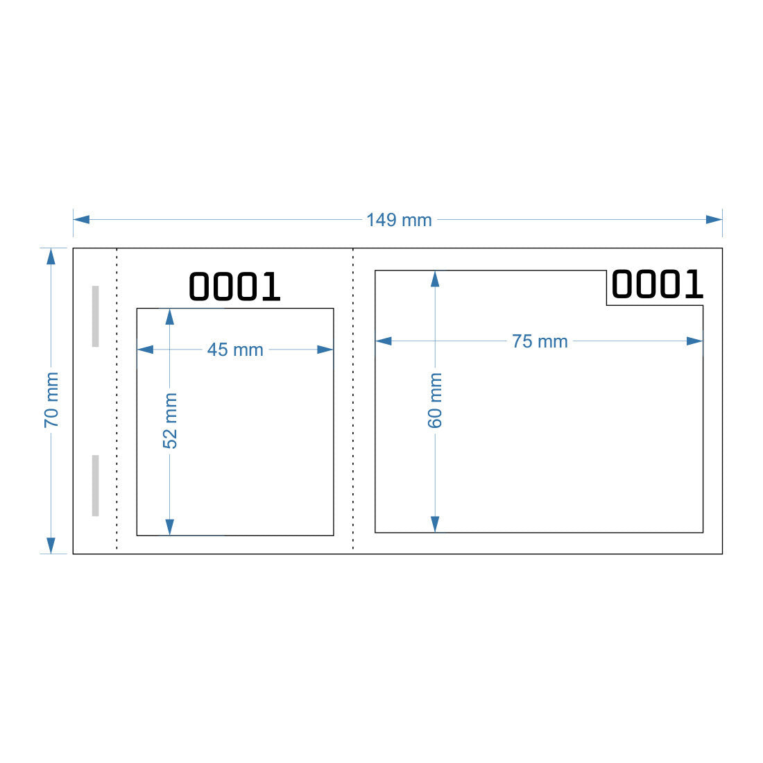 Die Lose sind in praktischen Teilblöcken gebündelt und haben das Format 148,5 x 70 mm. Dabei misst der linke Abschnitt 54 x 70 mm und der rechte Abschnitt 76,5 x 70 mm. Hergestellt werden die Lose aus robustem 120 g/m²-Papier. Dank der beidseitigen Perforation lassen sich die Abschnitte leicht und sauber abtrennen – ideal für eine schnelle Ausgabe.