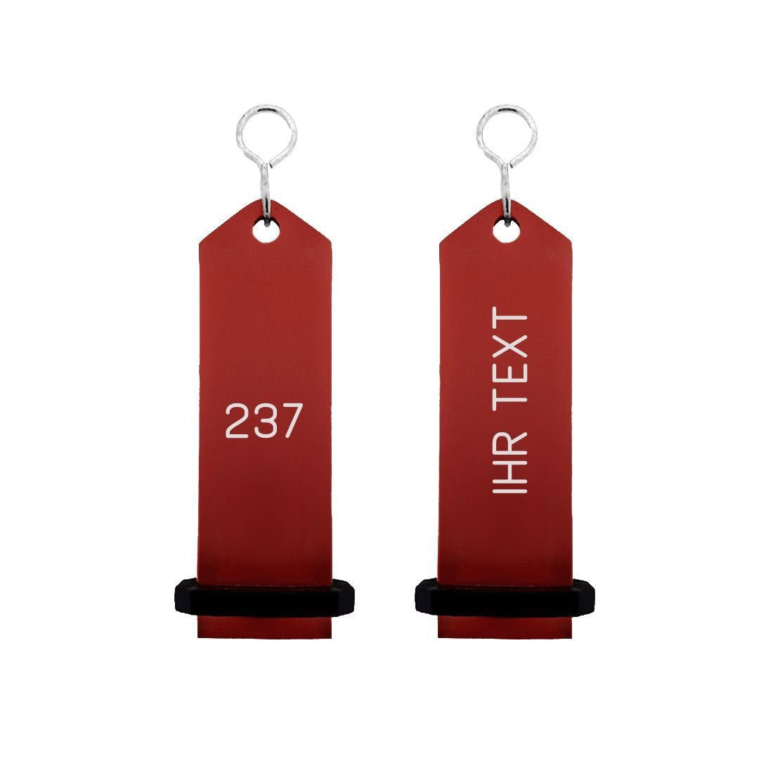 Der dezente Kontrast zwischen dem roten Aluminium und der Gravur sorgt für eine edle, gut lesbare Optik – ideal für den täglichen Einsatz in Ihrer Unterkunft.