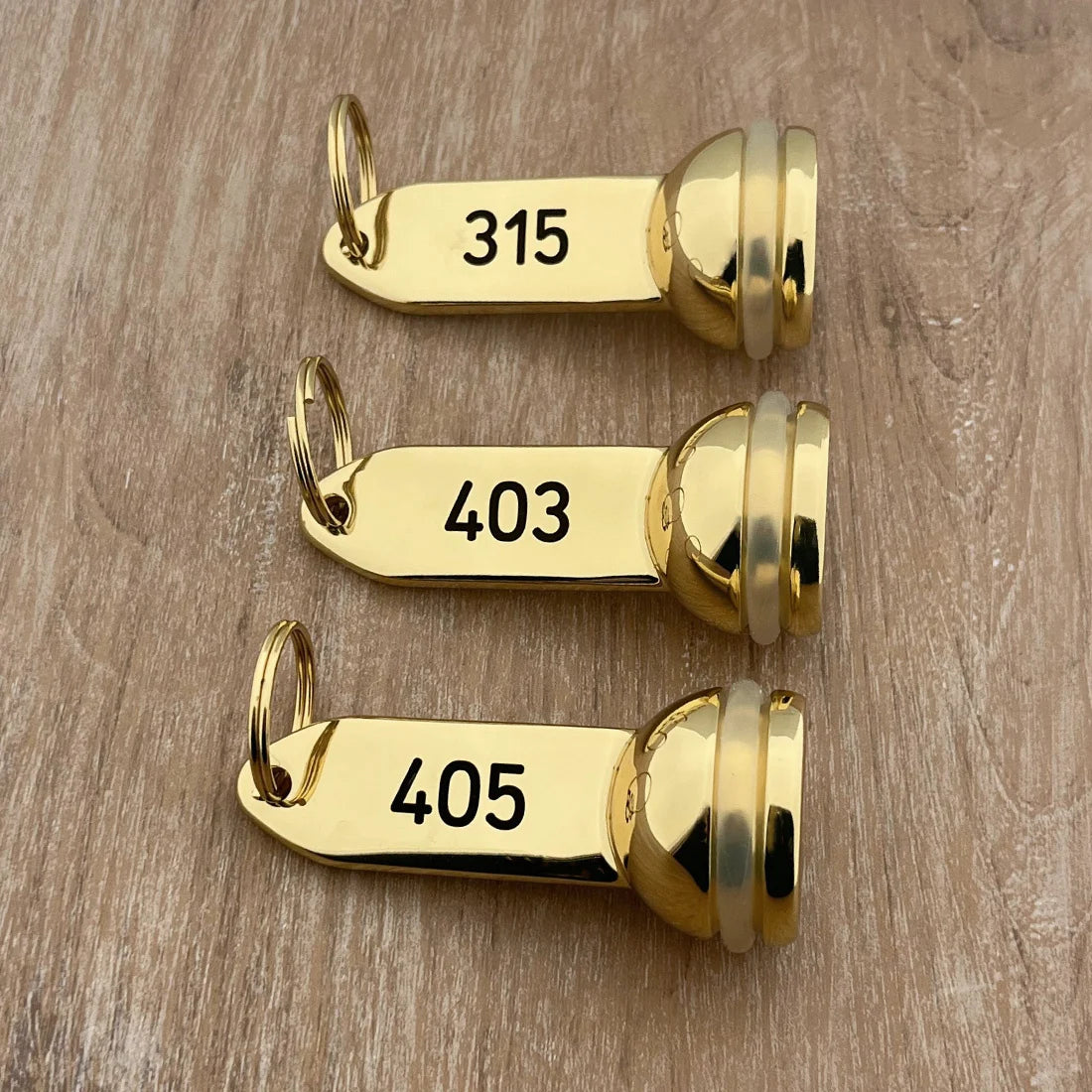 Der Capital-Hotelschlüsselanhänger aus glänzendem Messing besticht durch Luxus und Eleganz. Mit den Maßen 40 × 90 mm, 5 mm Dicke und 250 g Gewicht liegt er schwer in der Hand. Ausgestattet mit goldfarbenem Schlüsselring und Gummiring schützt er vor Beschädigungen und kann individuell mit Nummer, Text oder Logo graviert werden. Pro Stück zu bestellen. Lesen Sie mehr