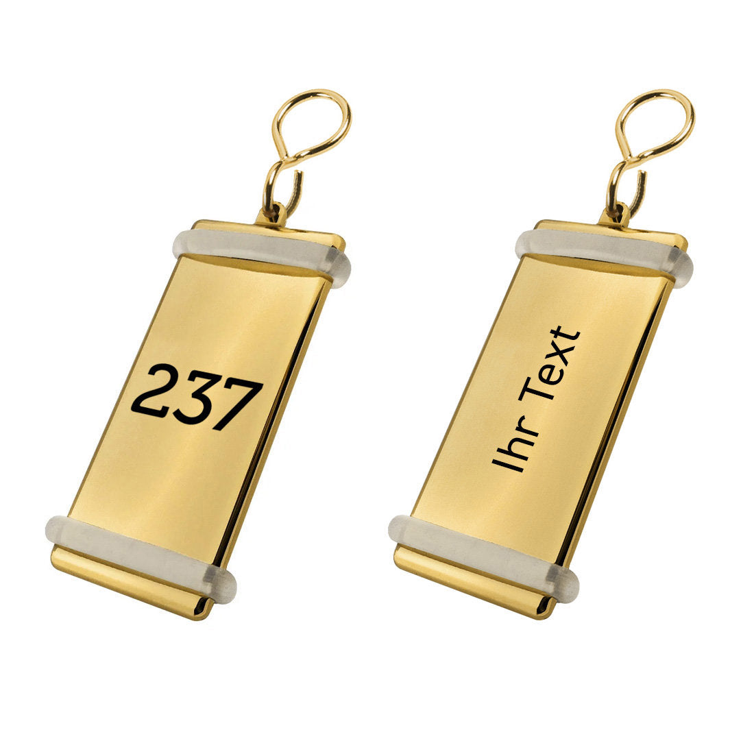 Der Montparnasse-Hotelschlüsselanhänger aus glänzendem Messing überzeugt mit eleganter Optik und hochwertiger Verarbeitung. Mit 33 × 77 mm, 5 mm Dicke und 102 g liegt er schwer in der Hand. Vorder- und Rückseite lassen sich individuell mit Logo, Text oder Nummer gravieren, dauerhaft in Schwarz. Pro Stück zu bestellen.