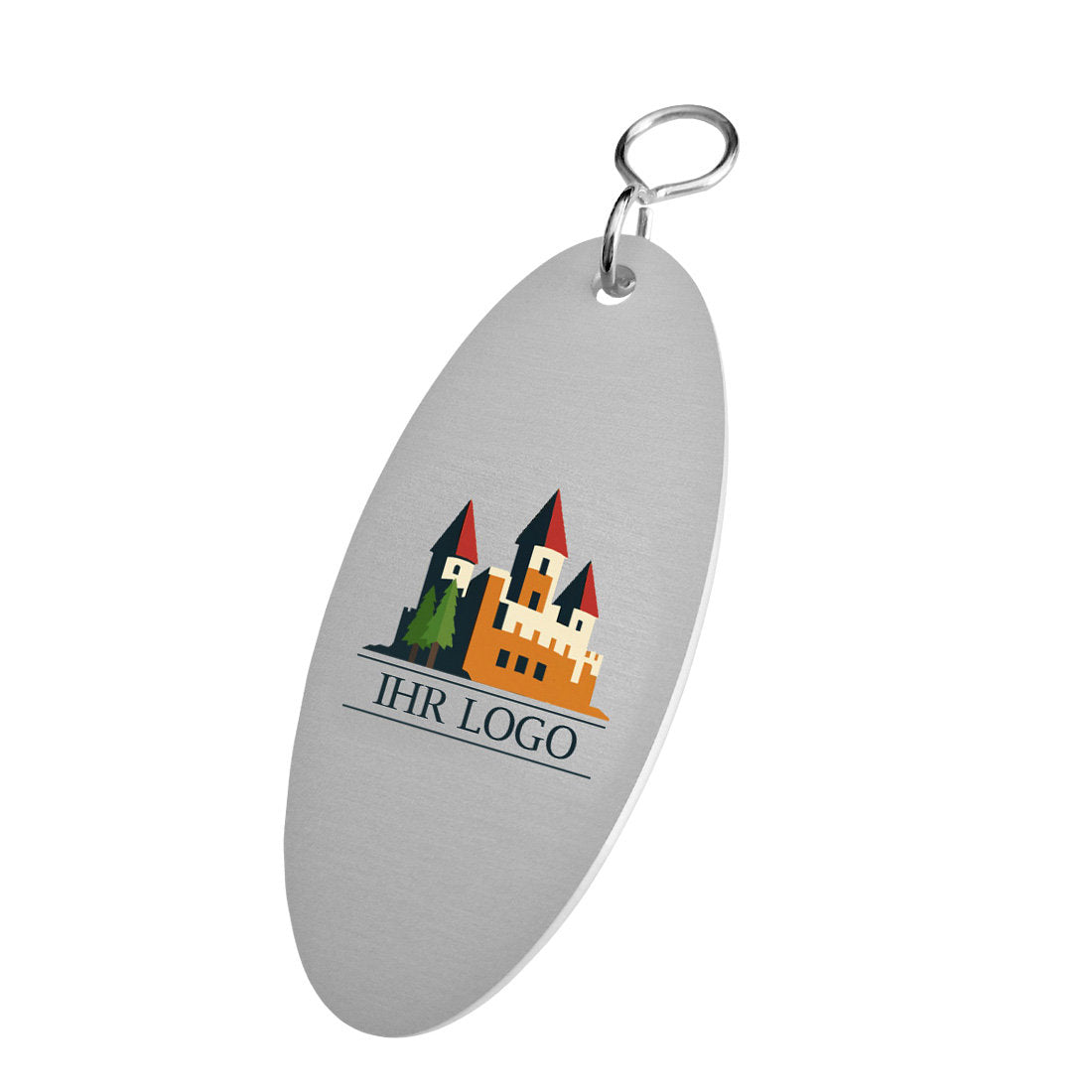 Der Santisimo Hotelschlüsselanhänger aus eloxiertem Aluminium überzeugt durch elegante, ovale Form und silberne Optik. Maße: 40x90 mm, Stärke 3 mm, optionaler Schlüsselring. Individuell gestaltbar per Hydro-Eloxation mit Logo, Zimmernummer oder Text. Ab 10 Stück zu bestellen. Auch auf Vorrat bestellbar. Lesen Sie mehr