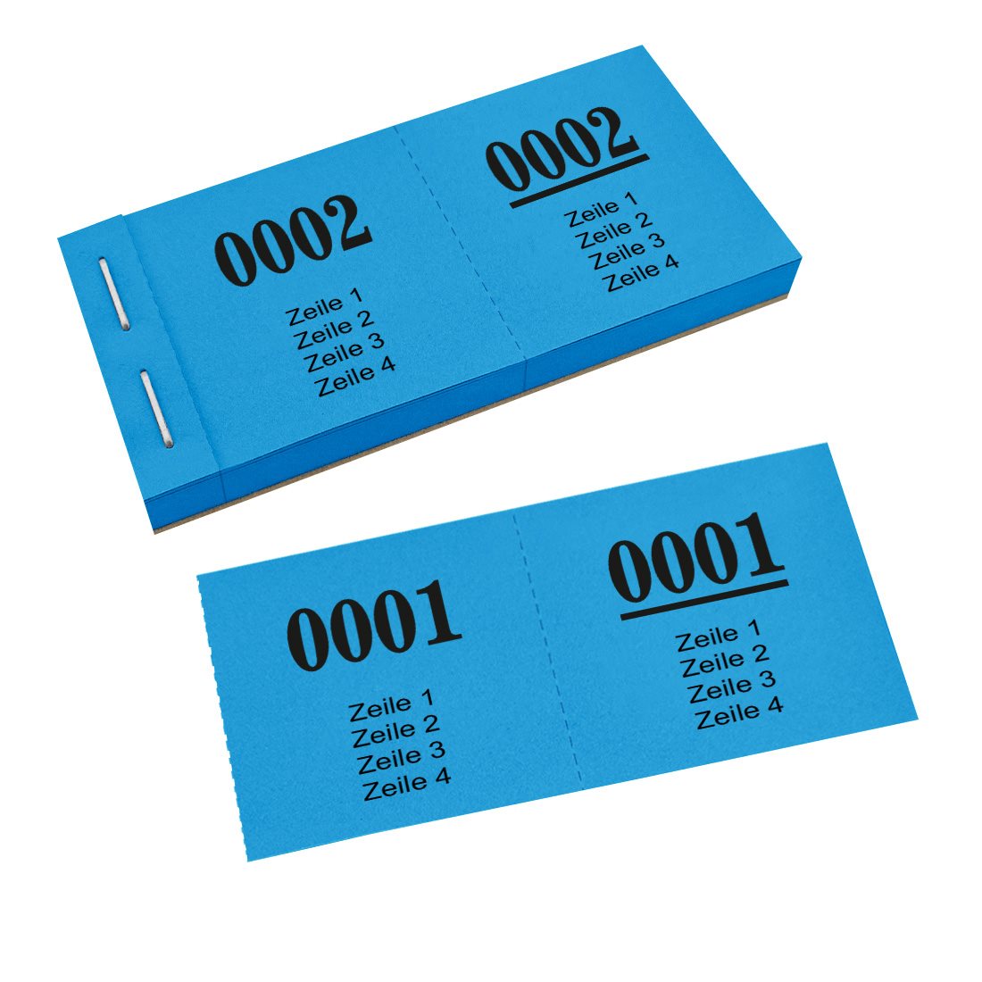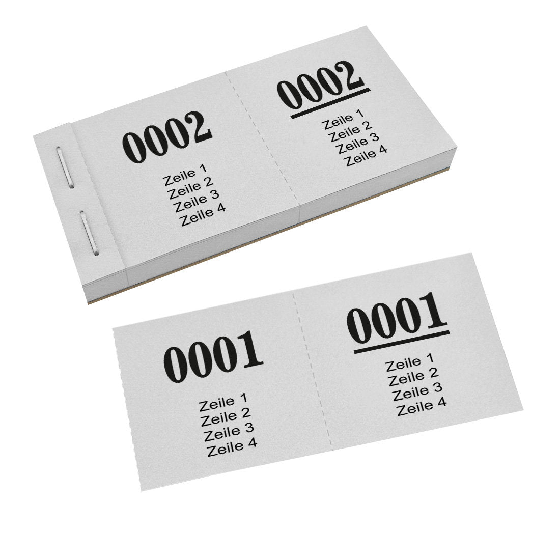 Doppelnummer-Lose im Format 105 × 55,8 mm aus 120 g/m² Papier, mit praktischer Perforation für schnelle Ausgabe. Je 1.000 fortlaufend nummerierte Lose, verteilt auf 20 Blöcke. Mit bis zu 4 personalisierbaren Textzeilen à 15 Zeichen – ideal für Veranstaltungen und Verlosungen. Lesen Sie mehr
