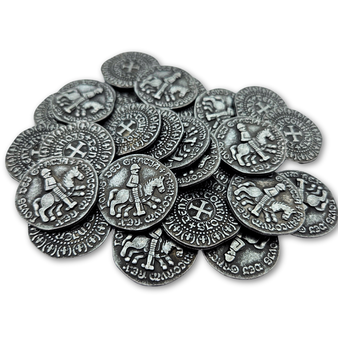 Entdecken Sie die mittelalterlichen Münz-Nachbildung, gefertigt aus hochwertiger Gussbronze und veredelt mit einem silbernen Farbton. Mit einem Durchmesser von ca. 24 mm und einem detaillierten Relief sind diese Münzen perfekt für Mittelalterfeste, Theaterstücke oder als dekoratives Element. Erhältlich im Set zu 100 Stück. Lesen Sie mehr