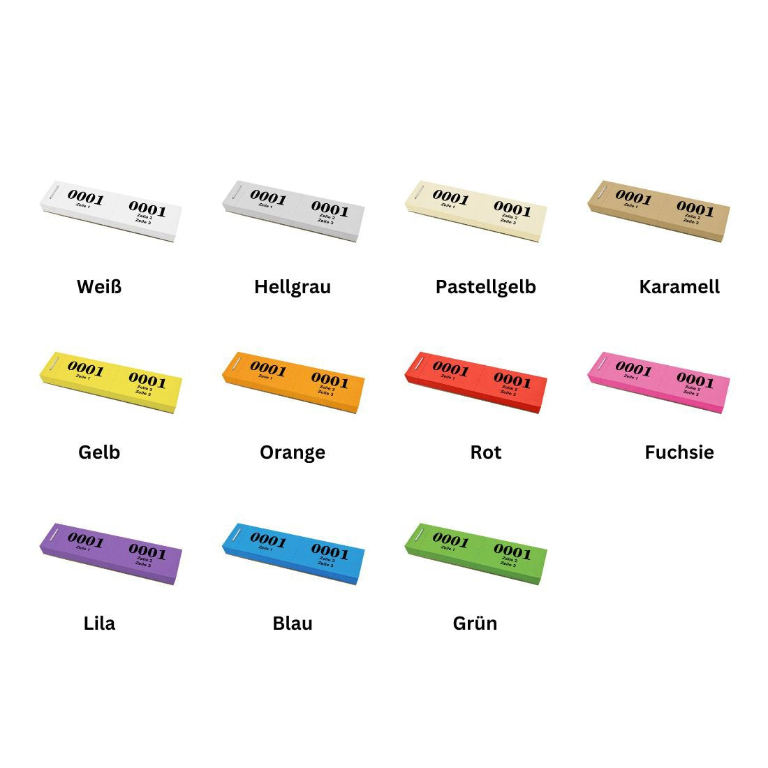 Alle Nummernblocks sind fortlaufend nummeriert – z. B. von 0001 bis 2000 pro Bestellung. Bei einer Bestellung von 3 × 2.000 Doppelnummern erhalten Sie die Nummern 0001 bis 6000. Die Zahlen sind gut lesbar und deutlich in Schwarz aufgedruckt. Bei Bestellungen in mehreren Farben beginnt die Nummerierung je Farbe erneut bei 0001. Wenn Sie eine spezielle Nummernfolge wünschen, können Sie diese im Anmerkungsfeld Ihrer Bestellung angeben.
