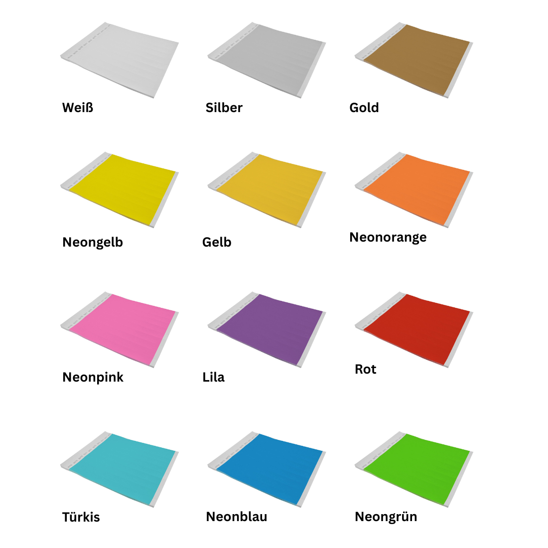 Die Einlassbänder werden auf handlichen Bögen zu je zehn Stück geliefert. Insgesamt enthält ein Set 10 Bögen, also 100 durchnummerierte Bänder, die sich ganz einfach voneinander abtrennen lassen. Für spontane Beschriftungen können die Bänder mit Kugelschreiber oder wasserfestem Stift individuell markiert werden, etwa mit Namen oder Gruppenzugehörigkeit.