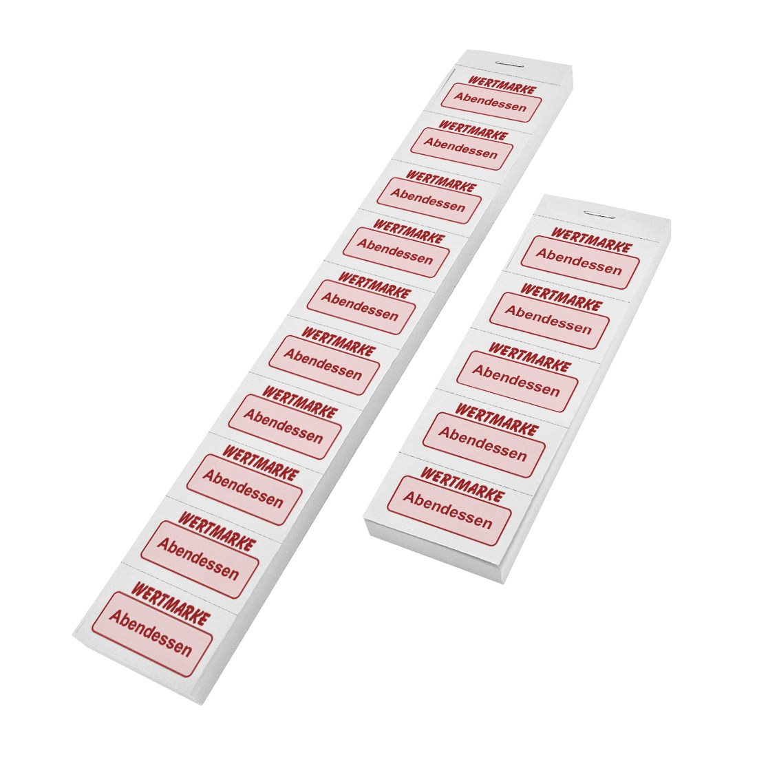 Diese Wertmarken sind in praktischen Blöcken organisiert, die entweder mit 5er- oder 10er-Streifen geliefert werden. Dank der präzisen Perforation lassen sich die einzelnen Marken mühelos entnehmen und schnell an Gäste oder Teilnehmer ausgeben. Der Verkauf erfolgt pro 1.000 Abrisse per Satz, sodass Sie auch für große Veranstaltungen bestens ausgestattet sind.