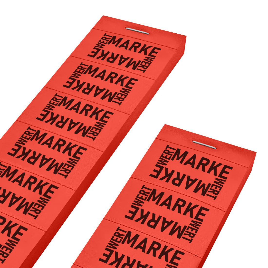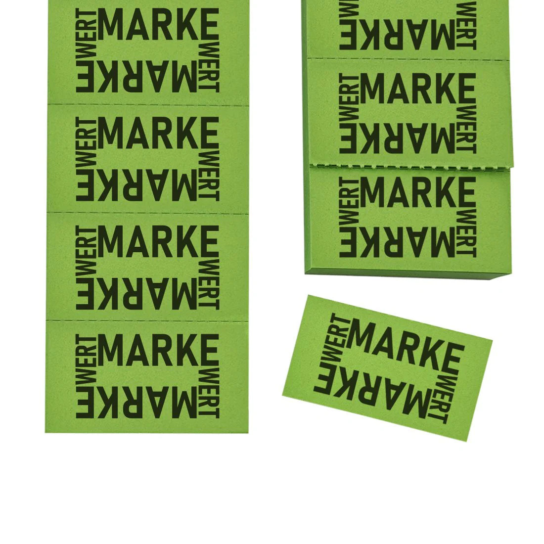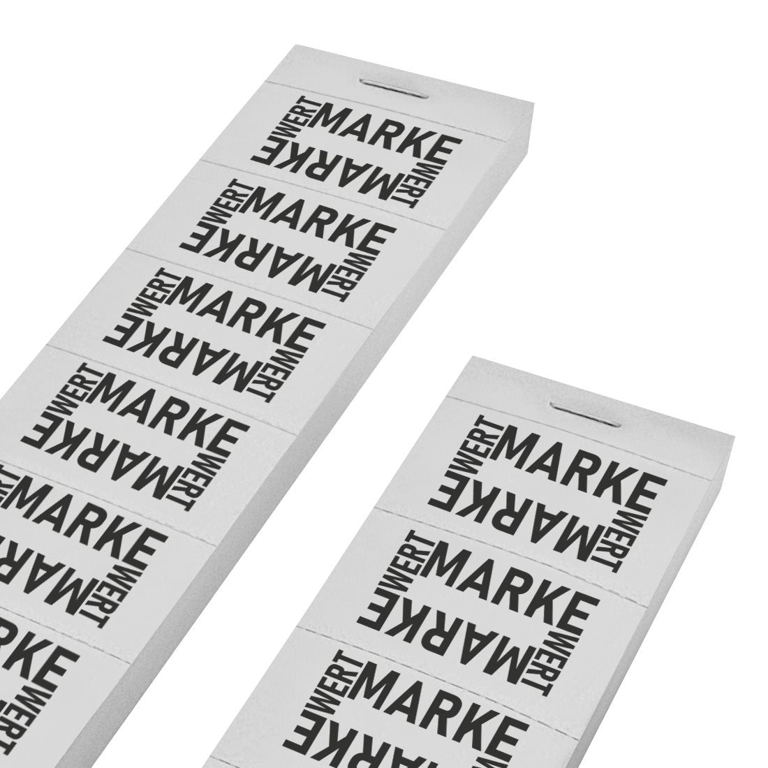 Diese 50 x 27,5 mm großen Wertmarken sind mit dem Text 'Wertmarke' im modernen Stil versehen. Die robusten Papierwertmarken (160 g/m²) sind in einem Block auf 5er oder 10er Streifen zusammengefasst und lassen sich dank Perforation leicht entnehmen. Ideal für Veranstaltungen und Gastronomie. Verkauf pro 1000 Abrisse pro Satz.