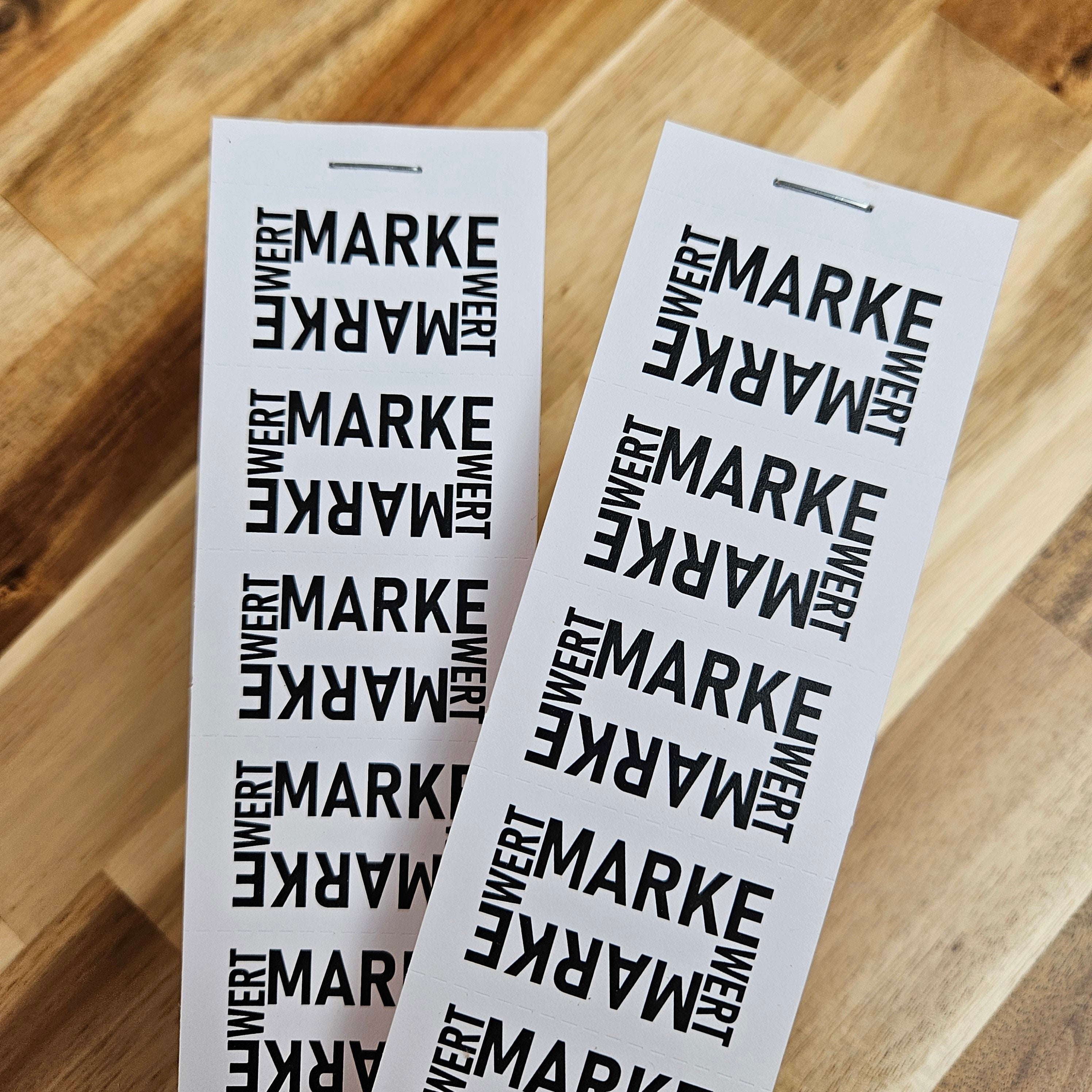 Diese 50 x 27,5 mm großen Wertmarken sind mit dem Text 'Wertmarke' im modernen Stil versehen. Die robusten Papierwertmarken (160 g/m²) sind in einem Block auf 5er oder 10er Streifen zusammengefasst und lassen sich dank Perforation leicht entnehmen. Ideal für Veranstaltungen und Gastronomie. Verkauf pro 1000 Abrisse pro Satz. Lesen Sie mehr