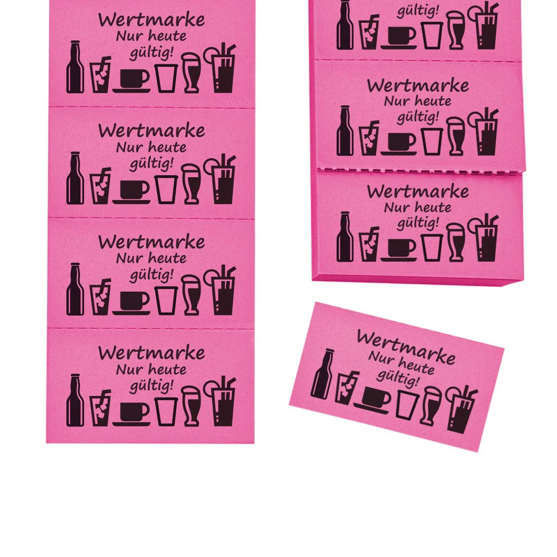 Diese 50 x 27,5 mm großen Wertmarken sind mit einem universellen Aufrduck und dem Text 'Wertmarke Nur heute gültig' versehen. Die robusten Papierwertmarken (160 g/m²) sind in einem Block auf 5er oder 10er Streifen zusammengefasst und lassen sich dank Perforation leicht entnehmen. Ideal für Veranstalungen und Gastronomie.Verkauf pro 1000 Abrisse per Satz.