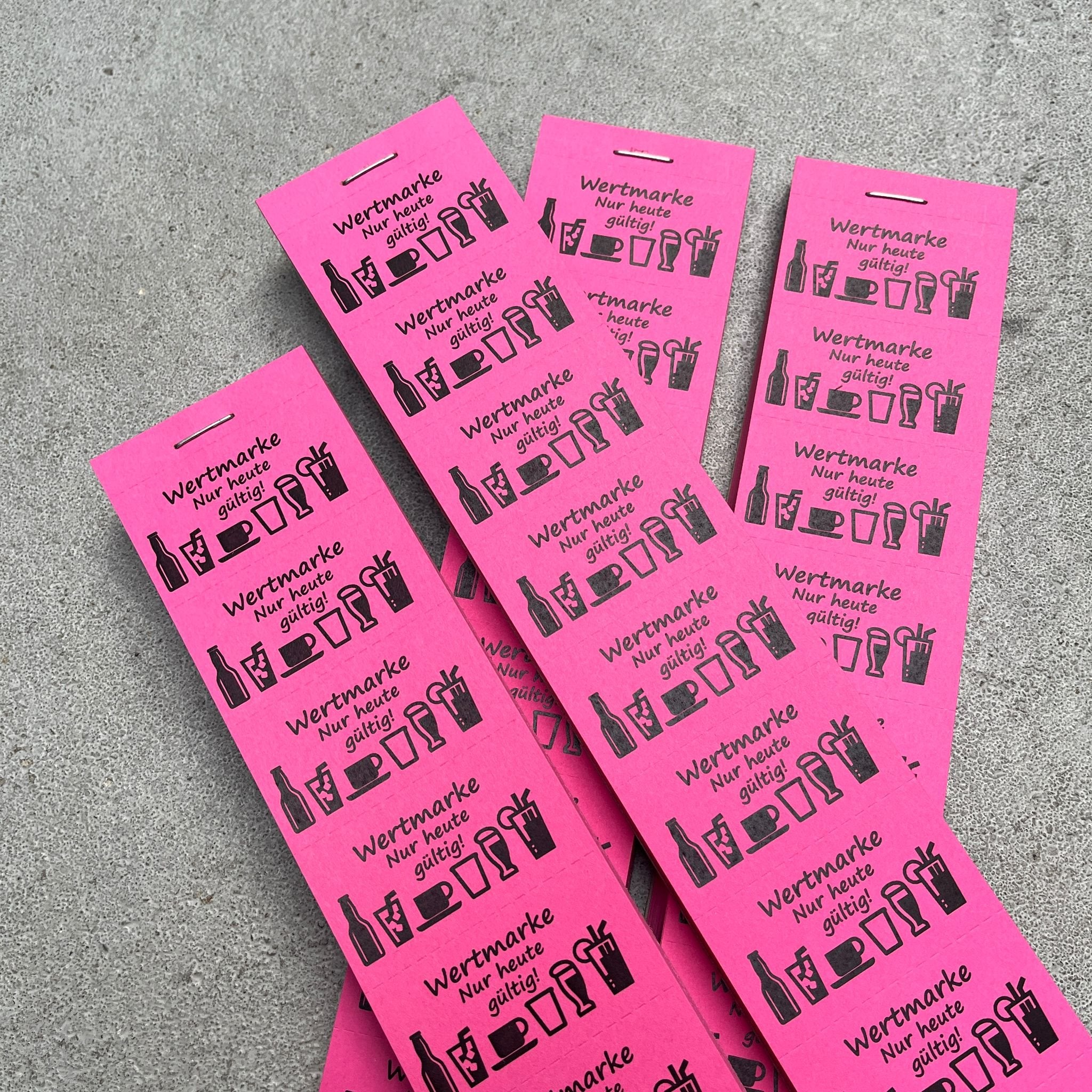 Diese 50 x 27,5 mm großen Wertmarken sind mit einem universellen Aufrduck und dem Text 'Wertmarke Nur heute gültig' versehen. Die robusten Papierwertmarken (160 g/m²) sind in einem Block auf 5er oder 10er Streifen zusammengefasst und lassen sich dank Perforation leicht entnehmen. Ideal für Veranstalungen und Gastronomie.Verkauf pro 1000 Abrisse per Satz. Lesen Sie mehr
