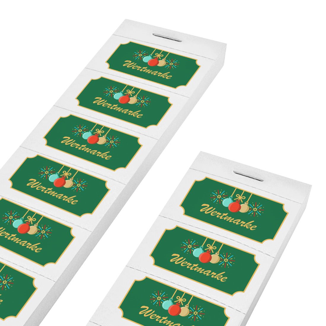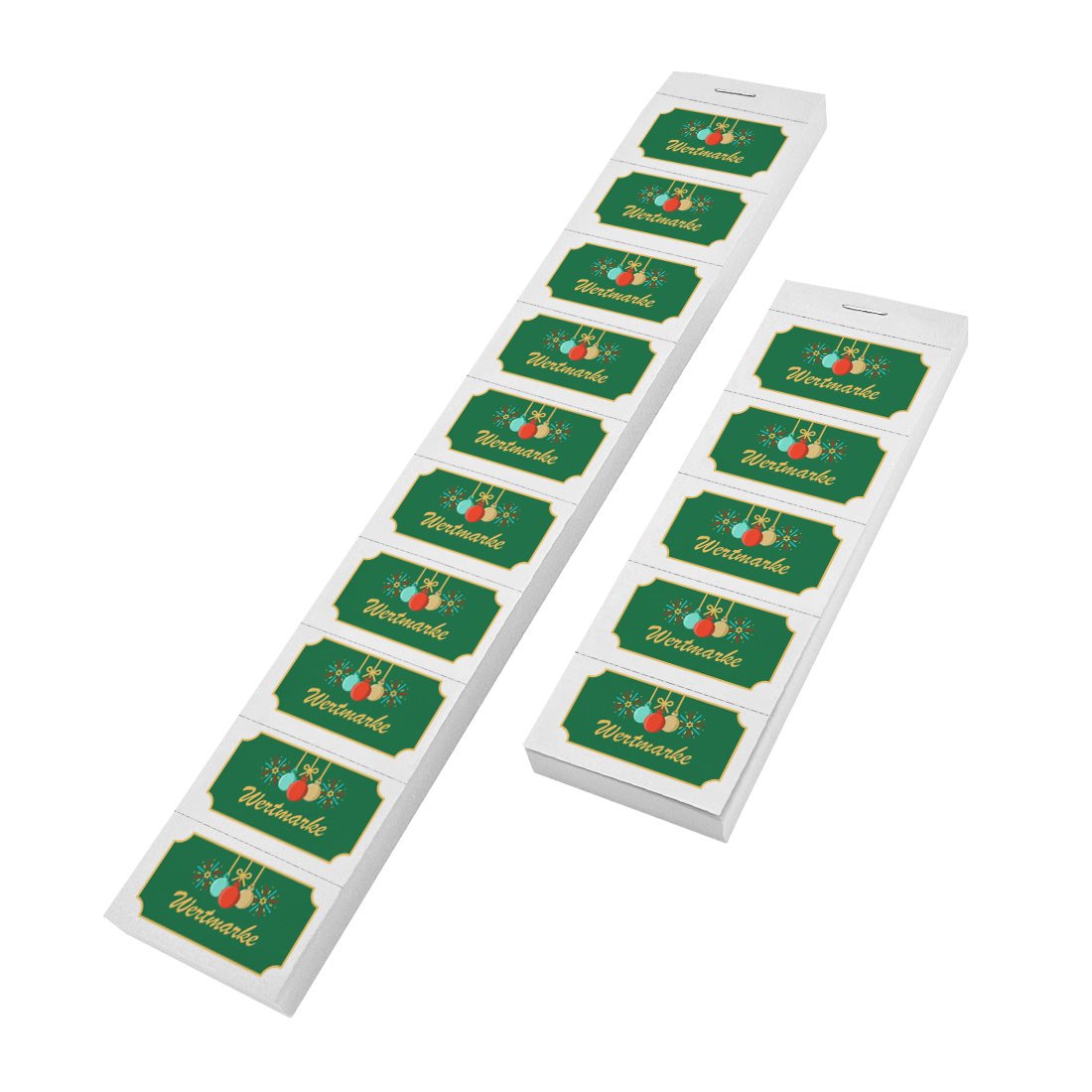 Entdecken Sie unsere festlichen Wertmarken, ideal für Weihnachtsmärkte sowie Weihnachts- und Neujahrsfeiern. Mit den kompakten Maßen von 50 x 27,5 mm sind diese robusten Papierwertmarken aus 160 g/m² eine praktische Lösung für die Ausgabe von Getränken oder Snacks. Die Marken sind in einem Block angeordnet und in 5er oder 10er Streifen zusammengefasst, was die Handhabung erleichtert. Jede Wertmarke ist einzeln perforiert, sodass sie mühelos abgerissen werden kann. Sie erhalten insgesamt 1.000 Abrisse pro Satz – perfekt für ein festliches Event!
