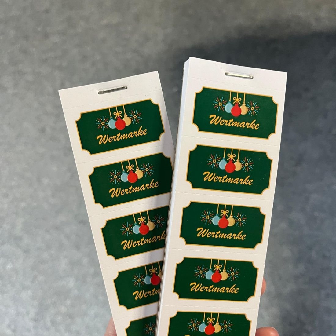 Entdecken Sie unsere festlichen Wertmarken, ideal für Weihnachtsmärkte sowie Weihnachts- und Neujahrsfeiern. Mit den kompakten Maßen von 50 x 27,5 mm sind diese robusten Papierwertmarken aus 160 g/m² eine praktische Lösung für die Ausgabe von Getränken oder Snacks. Die Marken sind in einem Block angeordnet und in 5er oder 10er Streifen zusammengefasst, was die Handhabung erleichtert. Jede Wertmarke ist einzeln perforiert, sodass sie mühelos abgerissen werden kann. Sie erhalten insgesamt 1.000 Abrisse pro Satz – perfekt für ein festliches Event! Lesen Sie mehr