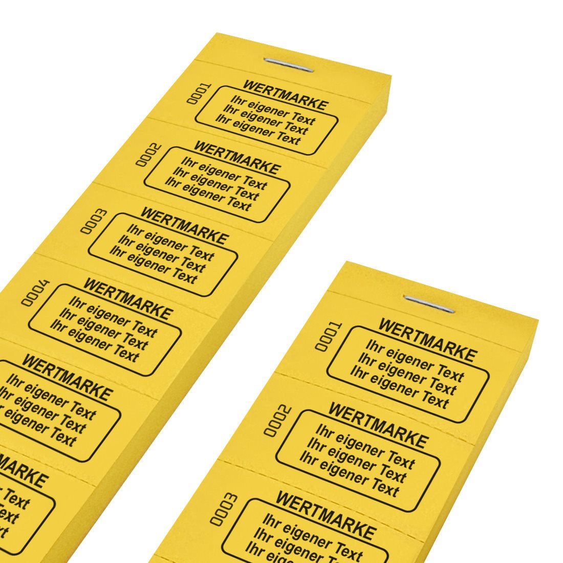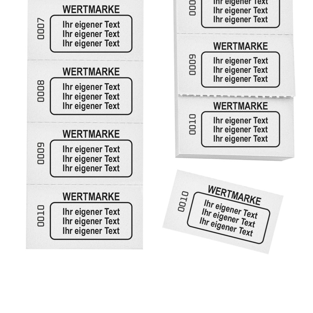 Wertmarken Block auf praktischen Streifen mit drei individuellen Textzeilen und fortlaufender Nummerierung - 1000 Abrisse pro Satz
