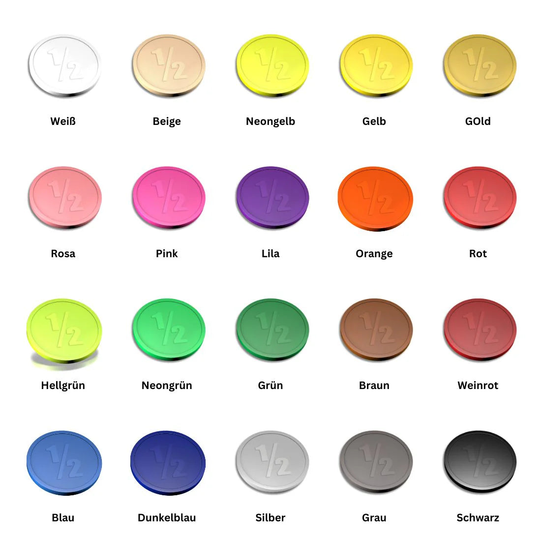 Hochwertige Kunststoff-Wertmarken-Chips mit einem Durchmesser von 29 mm und "1/2"-Prägung. Ideal als halbe Verzehr-, Kaffee- oder Getränkemarken. Langlebig, robust und in verschiedenen Farben erhältlich. Perfekt für Gastronomie, Events und Clubs. Erhältlich zu 250 Stück pro Packung.
