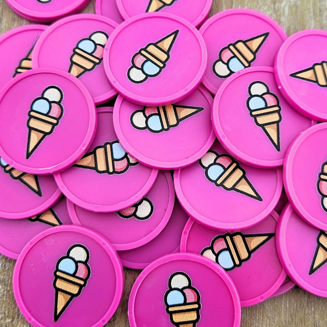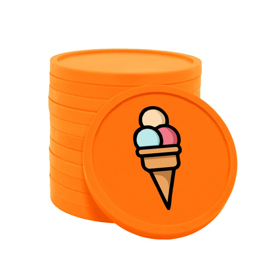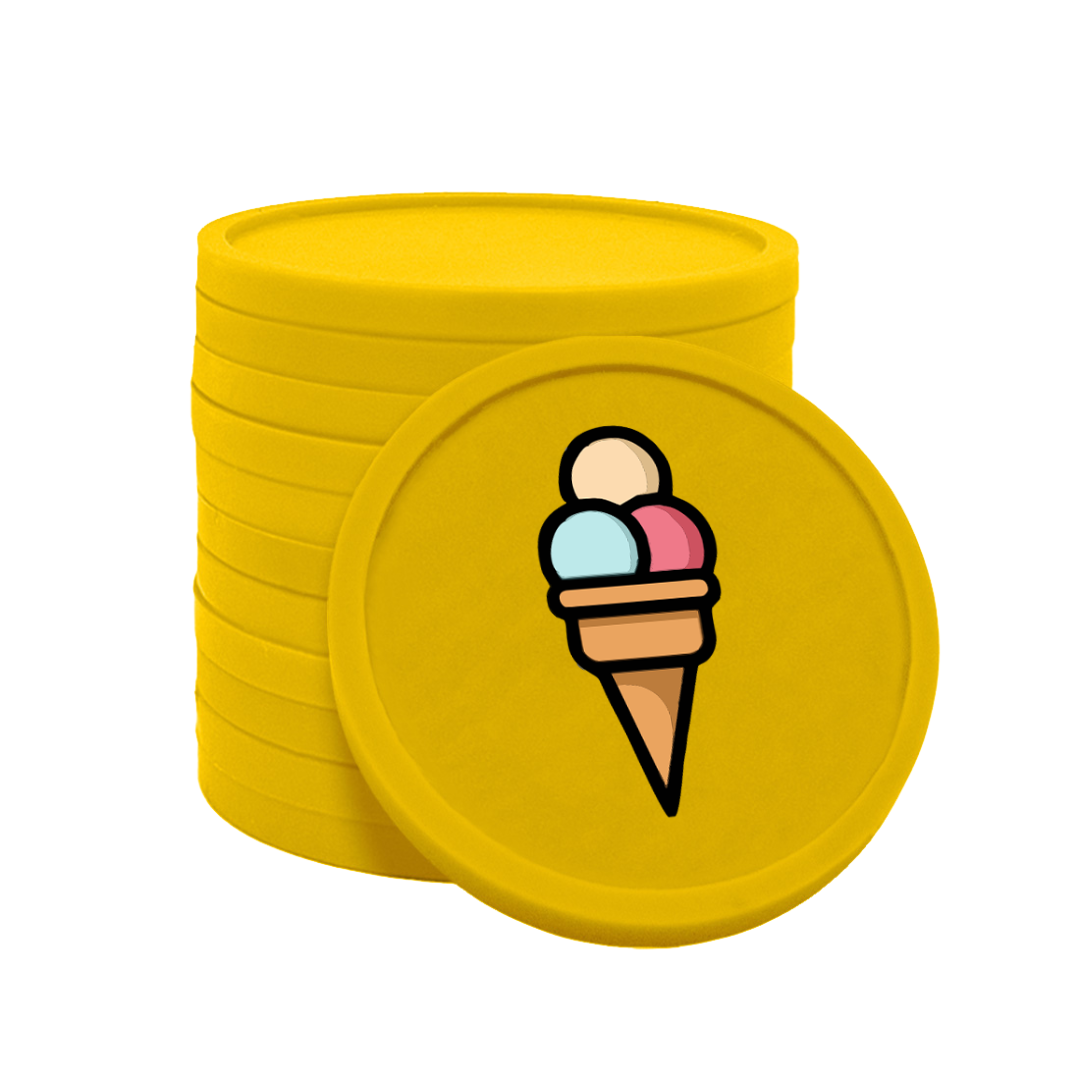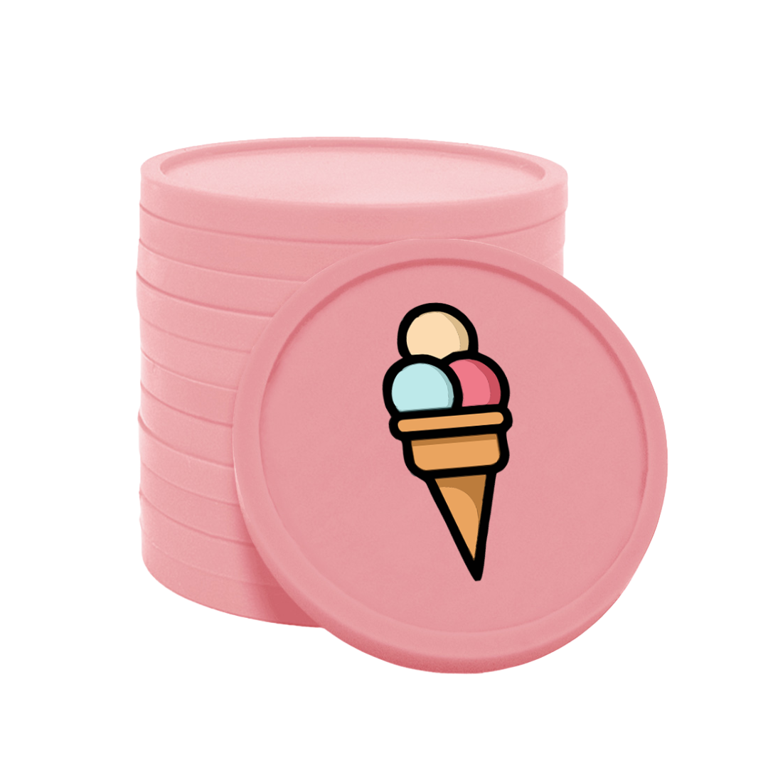 Bedruckte Kunststoff Wertmarken Chips mit 29 mm Durchmesser – robust, langlebig und ideal für Partys, Festivals und Events. Der einseitige Fullcolor-Aufdruck mit Eis ist optional auch doppelseitig möglich. 100 Stück pro Packung für eine einfache Organisation als Wertmarken oder Zahlungsmittel.