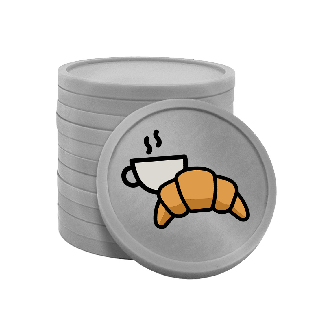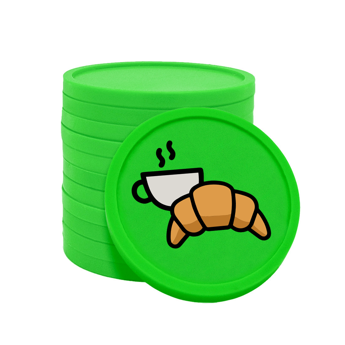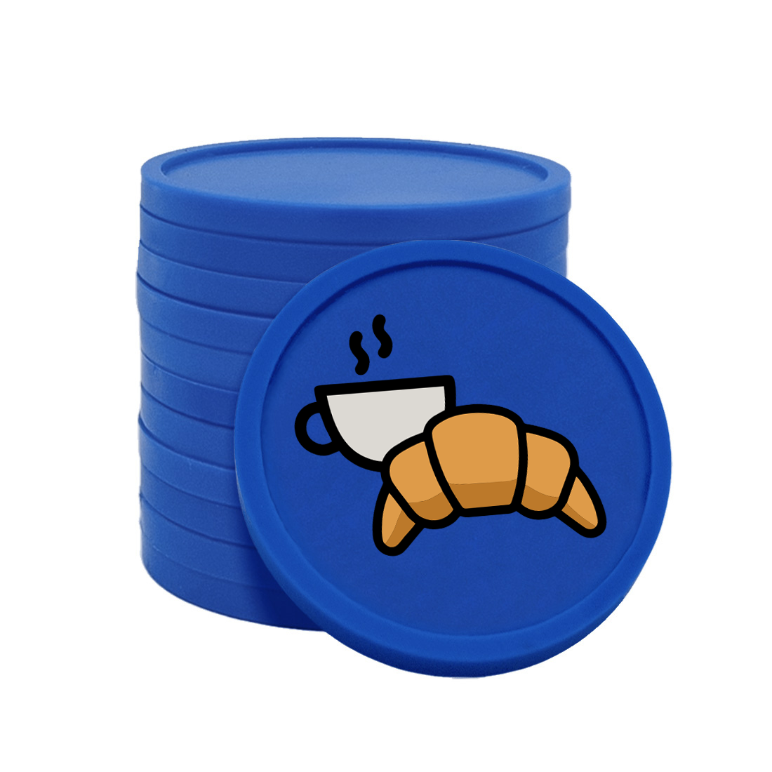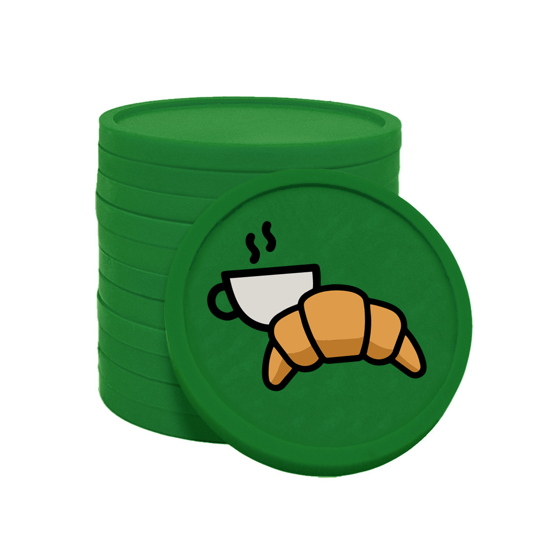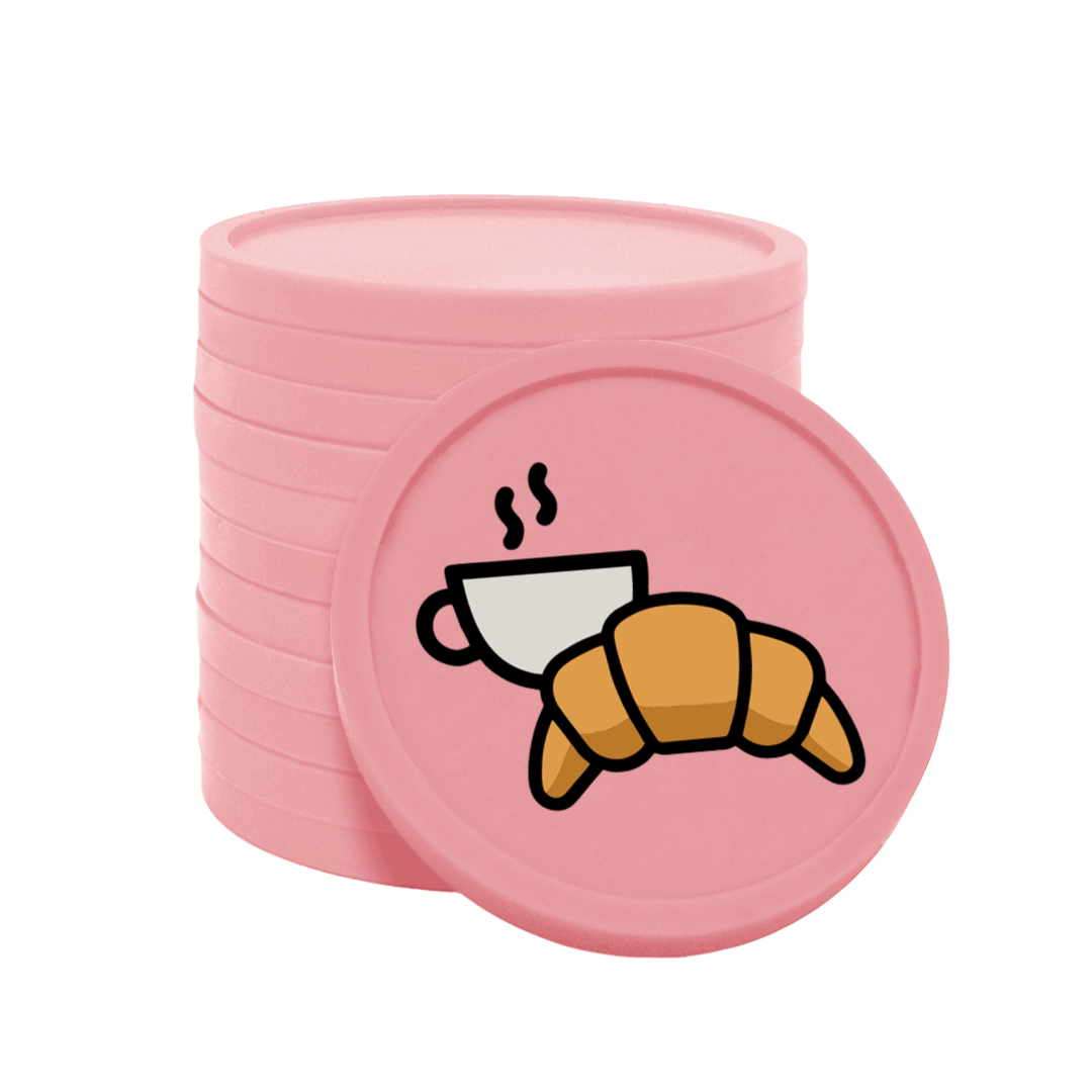 Bedruckte Kunststoff Wertmarken Chips mit 29 mm Durchmesser – robust, langlebig und ideal für Partys, Festivals und Events. Der einseitige Fullcolor-Aufdruck mit Kaffee & Croissant ist optional auch doppelseitig möglich. 100 Stück pro Packung für eine einfache Organisation als Wertmarken oder Zahlungsmittel.