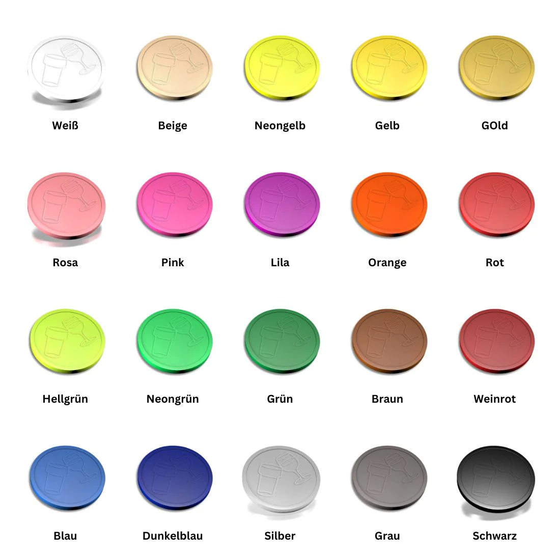 Die Wertmarken Chips mit 29 mm Durchmesser bieten eine stilvolle Lösung für Veranstaltungen. Mit stilvoller Bier- und Weinglas-Prägung sind sie in mehreren lebhaften Farben erhältlich, robust und erleichtern den Zahlungsprozess in Gastronomiebetrieben und bei Events.