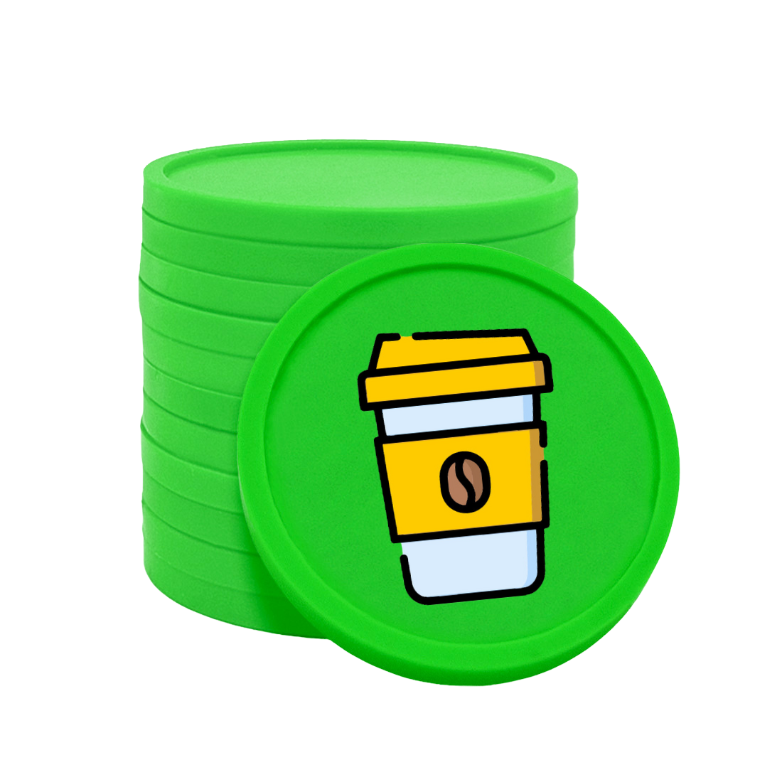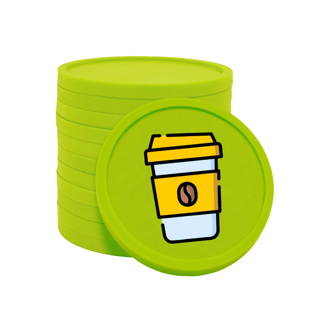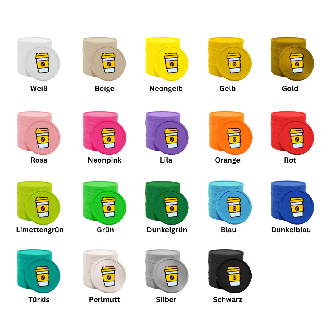 Farbig bedruckte Kunststoff-Wertmarken Chips – 29 mm Durchmesser, 100 Stück für Partys und Events. Langlebige, robuste Chips mit Kaffeebecher-Aufdruck in verschiedenen Farben, ideal als Getränkemarken oder Zahlungsmittel. Perfekt für Festivals, Feiern und Veranstaltungen.