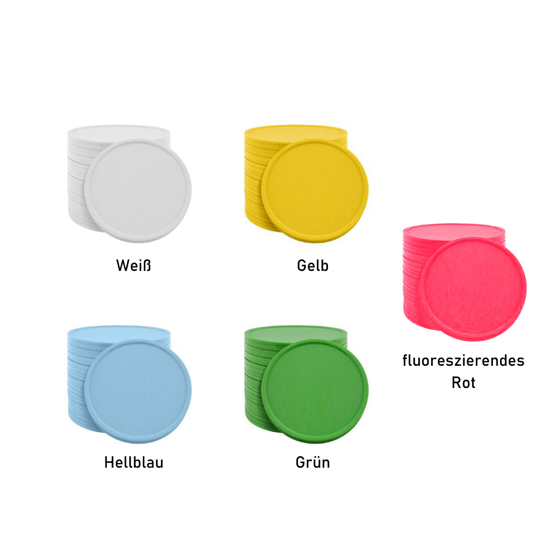 Farbige, unbedruckte Wertmarken Chips aus Kunststoff mit einem Durchmesser von 35 mm. Alle Wertmarken haben einen erhöhten Rand und eine Dicke von ca. 2,35 mm. Die Wertmarken werden in Einheiten von 100 Stück verkauft und sind in verschiedenen fröhlichen Farben erhältlich. Lesen Sie mehr