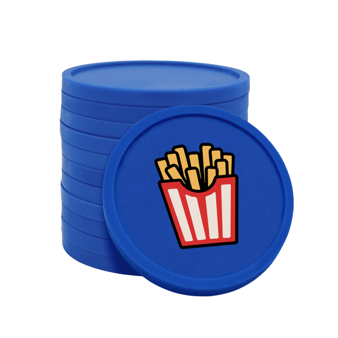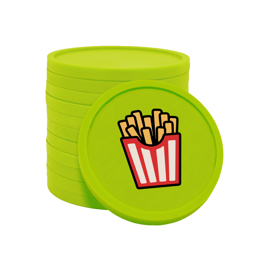 Bedruckte Kunststoff Wertmarken Chips mit 29 mm Durchmesser – robust, langlebig und ideal für Partys, Festivals und Events. Der einseitige Fullcolor-Aufdruck mit Pommes ist optional auch doppelseitig möglich. 100 Stück pro Packung für eine einfache Organisation als Wertmarken oder Zahlungsmittel.