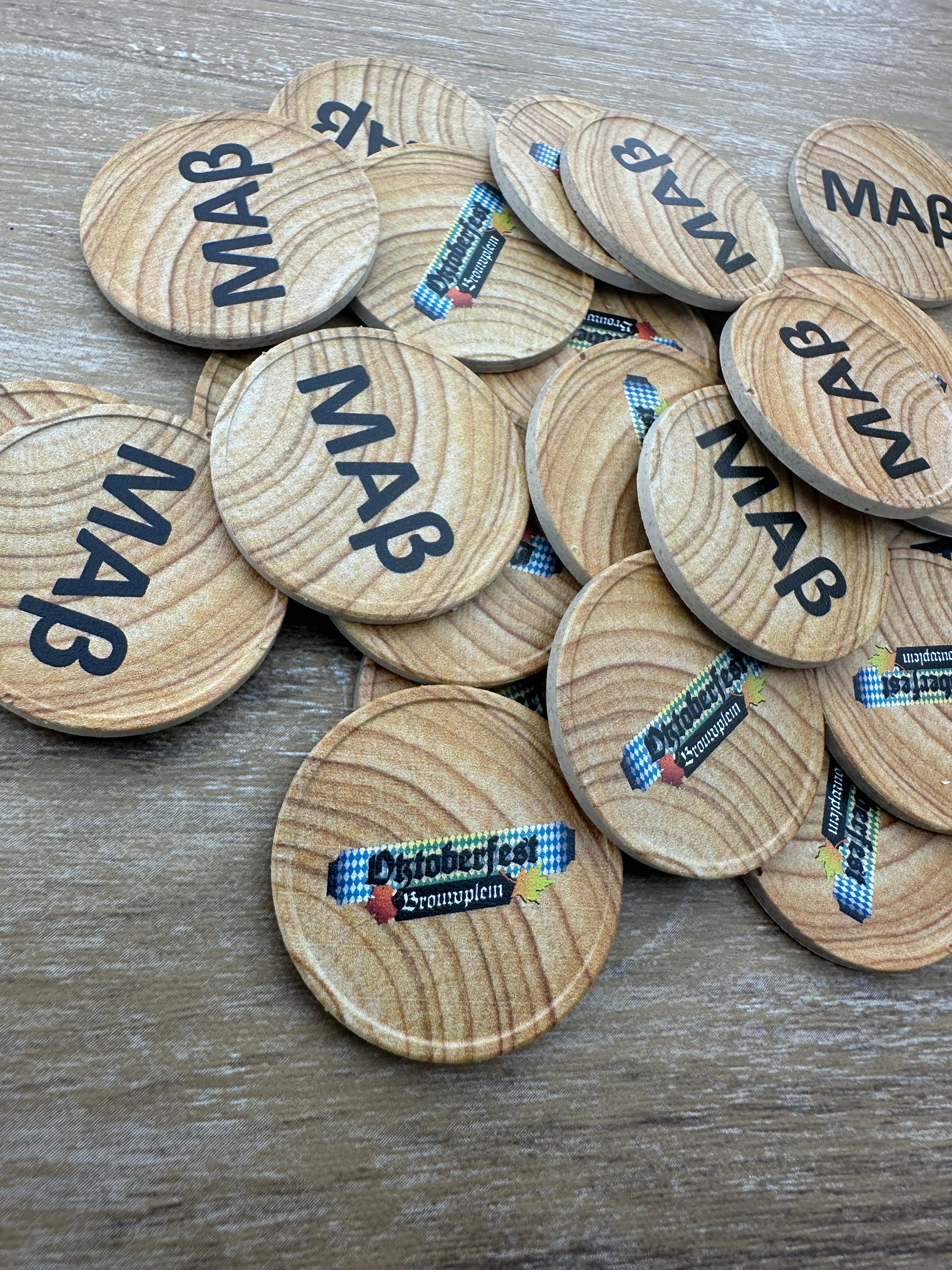Die umweltfreundlichen Wertmarken Chips bestehen aus einer nachhaltigen Kombination aus Holzfasern und Harz und sind biologisch abbaubar. Mit einem Durchmesser von 35 mm und einer Dicke von 2,35 mm sind sie robust, langlebig und vielseitig einsetzbar – ideal für Gastronomie, Festivals, Messen und Vereinsveranstaltungen. Jede Wertmarke ist mit einem natürlichen Maserungsmotiv versehen, das ihr ein hochwertiges, authentisches Erscheinungsbild verleiht. Dank der individuellen Bedruckung lassen sich die Chips mit Ihrem Logo, Text oder Motiv gestalten, auch mit unterschiedlichen Designs auf beiden Seiten.