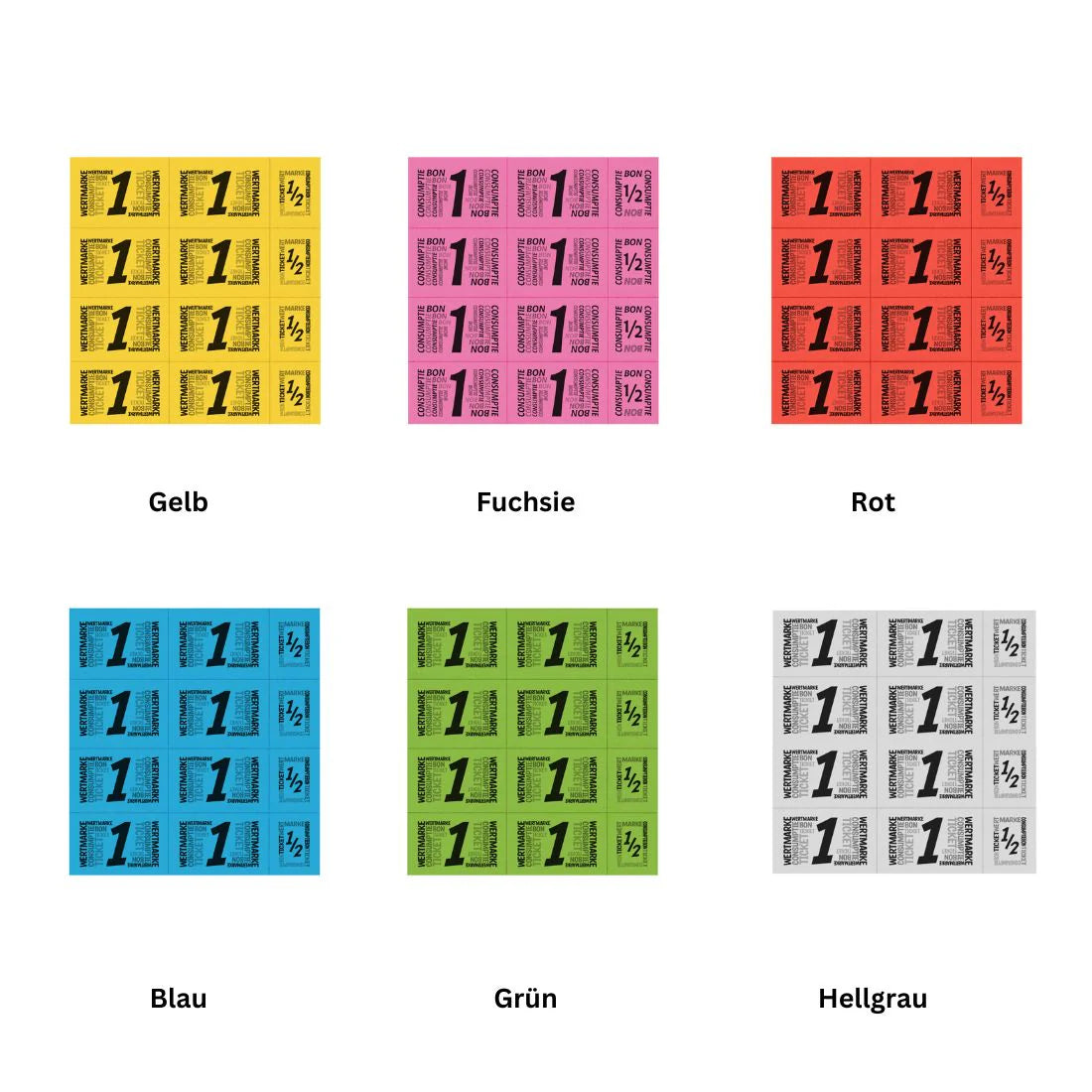 Die Wertmarken-Karten im Format 102,5 x 110 mm bieten mit ganzen und halben Werten maximale Flexibilität und ergeben pro Karte insgesamt 10 Einheiten – ideal für den Einsatz auf Events, Partys und Zusammenkünften. Das universelle Design und die praktische Einzelperforation sorgen dafür, dass sich die Marken schnell und unkompliziert abtrennen lassen. In verschiedenen Farben mit klassischem schwarzen Aufdruck erhältlich, passen sich die Karten problemlos jedem Event-Thema an. Ein Satz umfasst 50 Karten – perfekt für Veranstaltungen jeder Größe.