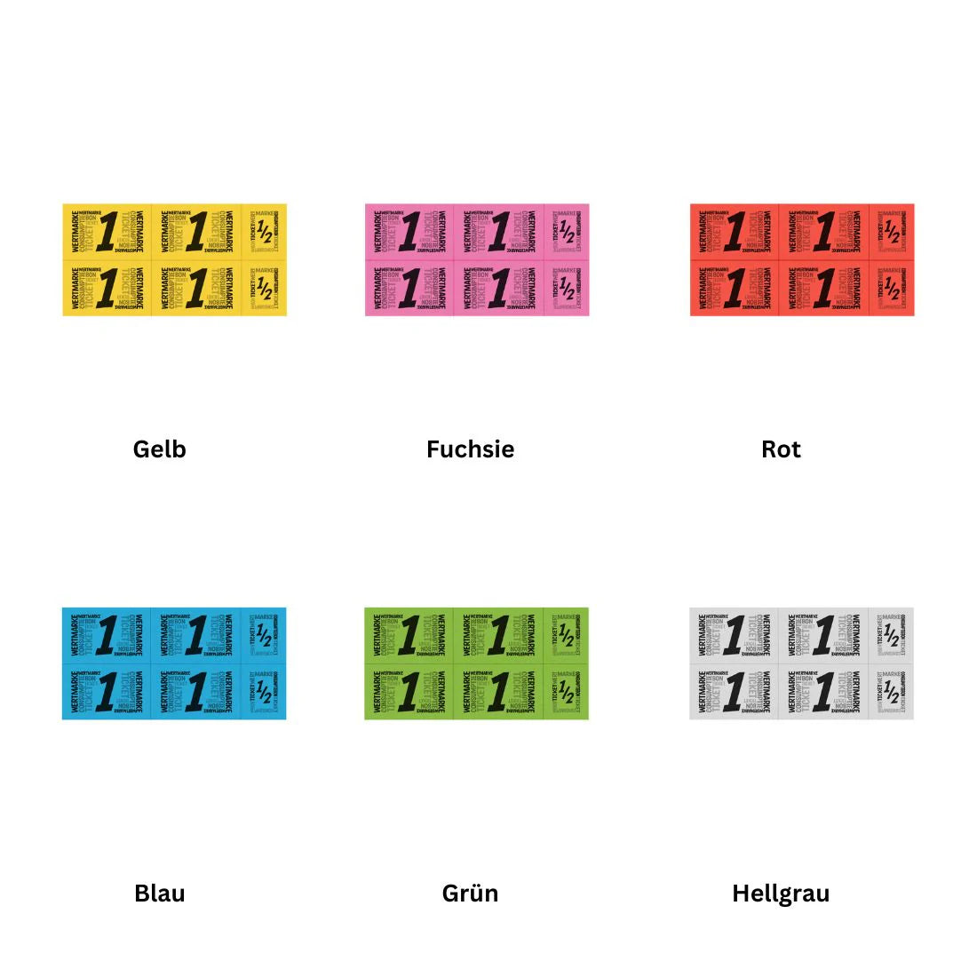 Die Wertmarken-Karten im Format 102,5 x 55 mm bieten mit ganzen und halben Werten maximale Flexibilität und ergeben pro Karte insgesamt 5 Einheiten – ideal für den Einsatz auf Events, Partys und Zusammenkünften. Das universelle Design und die praktische Einzelperforation sorgen dafür, dass sich die Marken schnell und unkompliziert abtrennen lassen. In verschiedenen Farben mit klassischem schwarzen Aufdruck erhältlich, passen sich die Karten problemlos jedem Event-Thema an. Ein Satz umfasst 50 Karten – perfekt für Veranstaltungen jeder Größe.