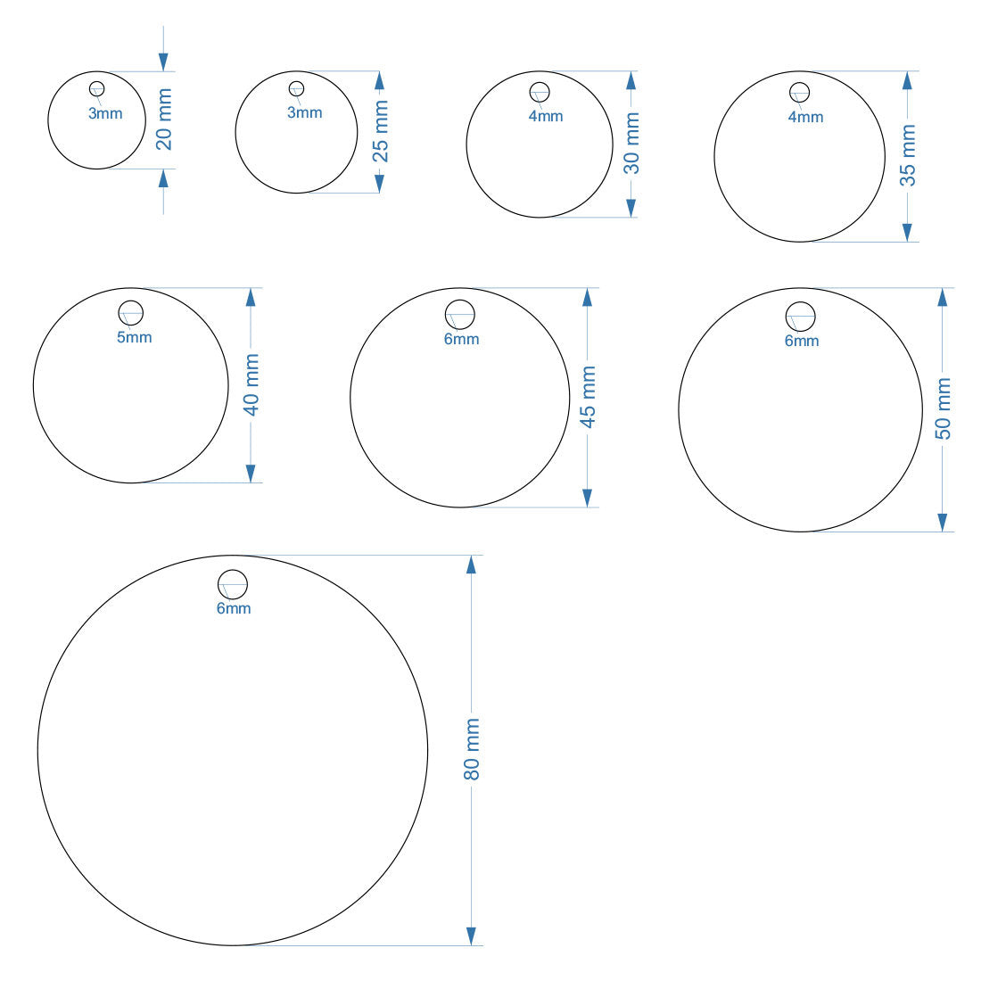 - 1,5 mm stark: 35 mm, 40 mm, 45 mm, 50 mm, 60 mm und 80 mm Durchmesser